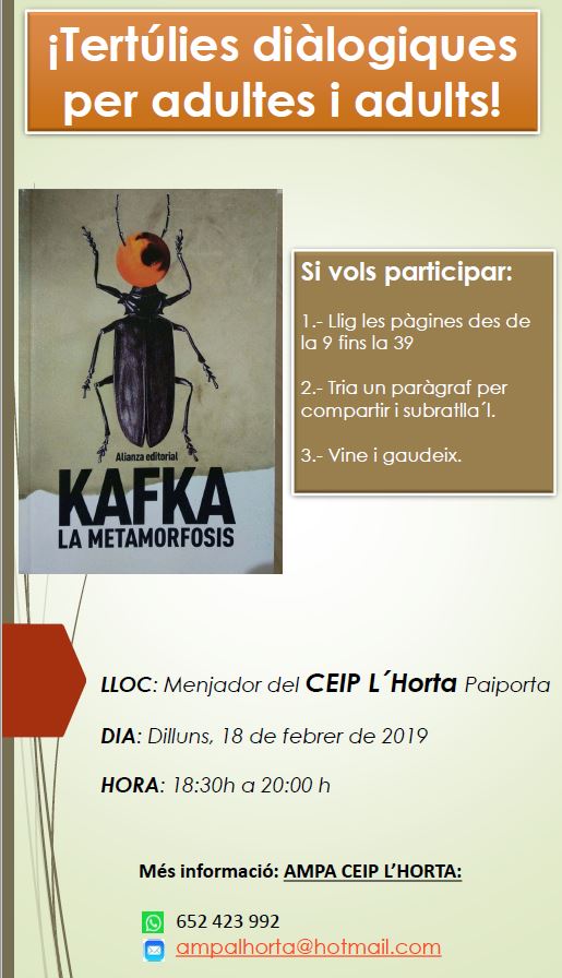 El próximo lunes 18 de febrero, a las 18:30 h, en el comedor de nuestro cole, comenzamos una serie de tertulias dialógicas para adult@s sobre la obra de Franz Kafka, «La Metamorfosis».
