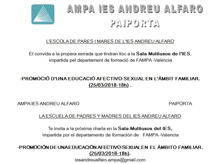 Nuestrxs compañerxs de la AMPA del IES Andreu Alfaro han invitado a las familias socias de nuestra AMPA a la Escuela de Padres y Madres que ellxs organizan. La próxima formación será este lunes 25 de marzo a las 18 h, y lleva como título «Promoció d’una educació afectivo-sexual en l’ambit familiar». La charla será en la Sala Multiusos del IES Andreu Alfaro.