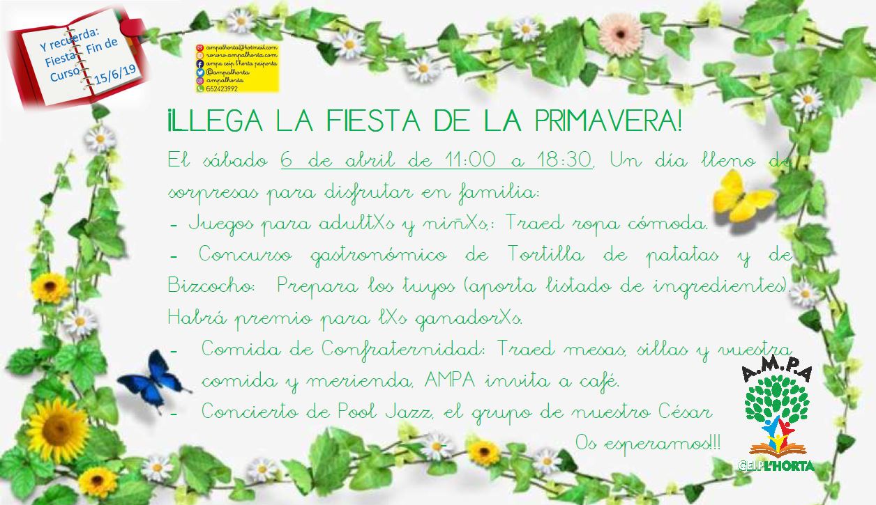 Con la llegada de la primavera, la AMPA organiza la Fiesta de la Primavera. Este año lo celebramos el sábado 6 de abril y será como colofón a las actividades que estamos preparando junto al cole durante esa semana, que la hemos llamado Semana de la Solidaridad (en los próximos días os daremos más información).