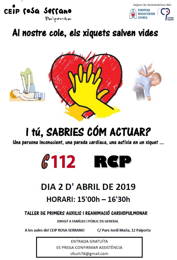 El próximo 2 de abril, de 15 a 16:30 h, el CEIP Rosa Serrano organiza un taller de primeros auxilios y reanimación cardiorespiratoria en sus aulas.