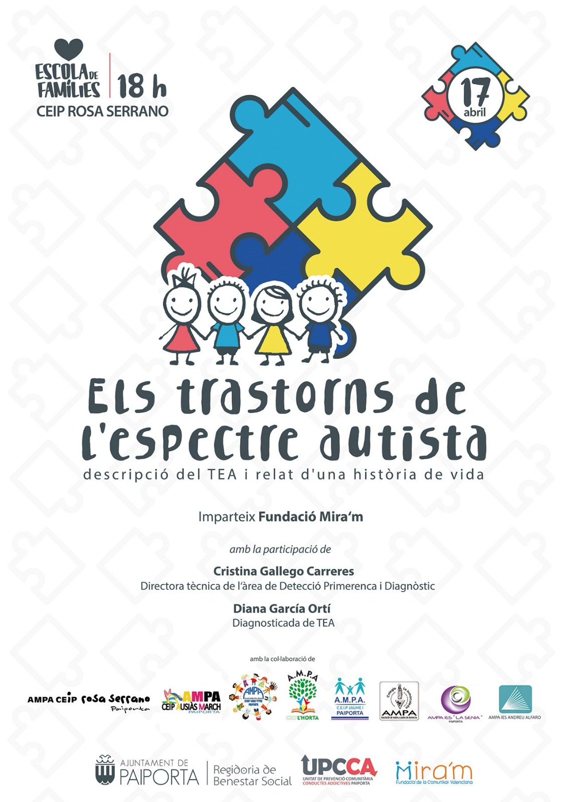 El próximo miércoles 17 de abril, a partir de las 18 h en el CEIP Rosa Serrano, la Regidoria de Benestar Sòcial en colaboración con las AMPAs de Paiporta, organizan una charla bajo el título «Els trastorns de l’espectre autista». La charla la imparte la Fundació Mira’m y pretende romper los tabús y conocer mejor los TEA.