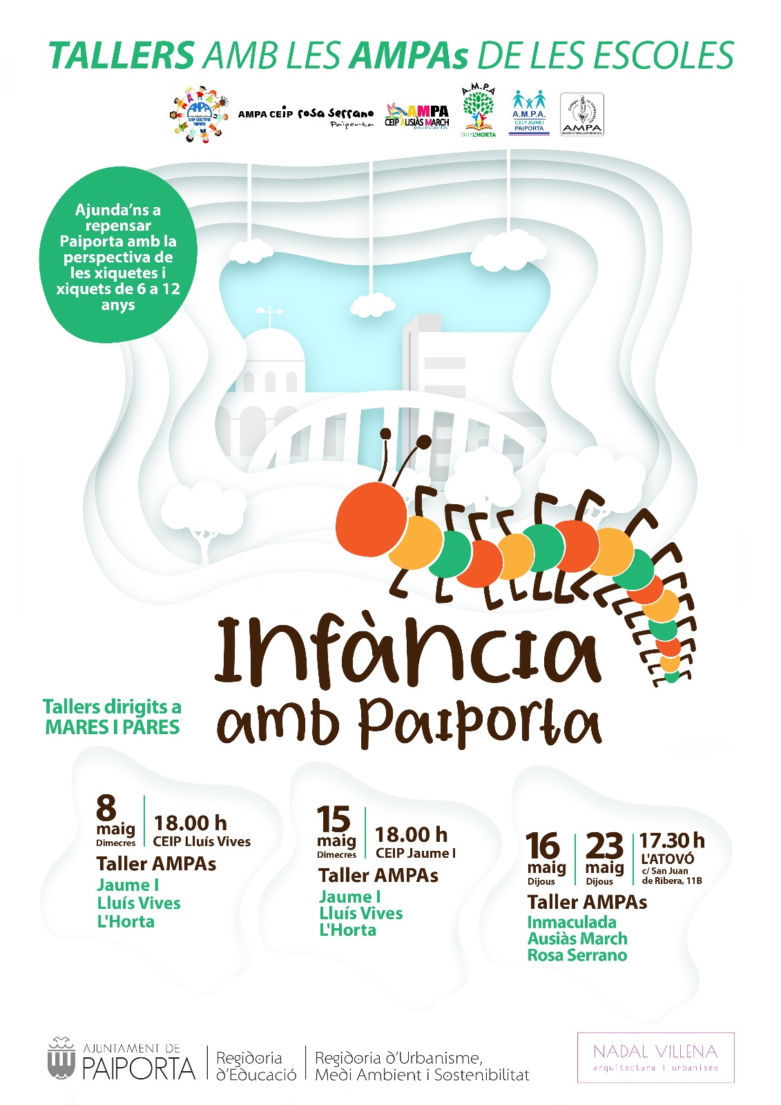 Este miércoles 8 de mayo, a las 18 h, en el CEIP Lluís Vives, estamos convocadas las familias de los centros Lluís Vives, Jaume I y L’Horta para el primer taller del proyecto «Infància amb Paiporta». Este proyecto tiene como objetivo repensar la ciudad con la perspectiva de las niñas y niños de 6 a 12 años.