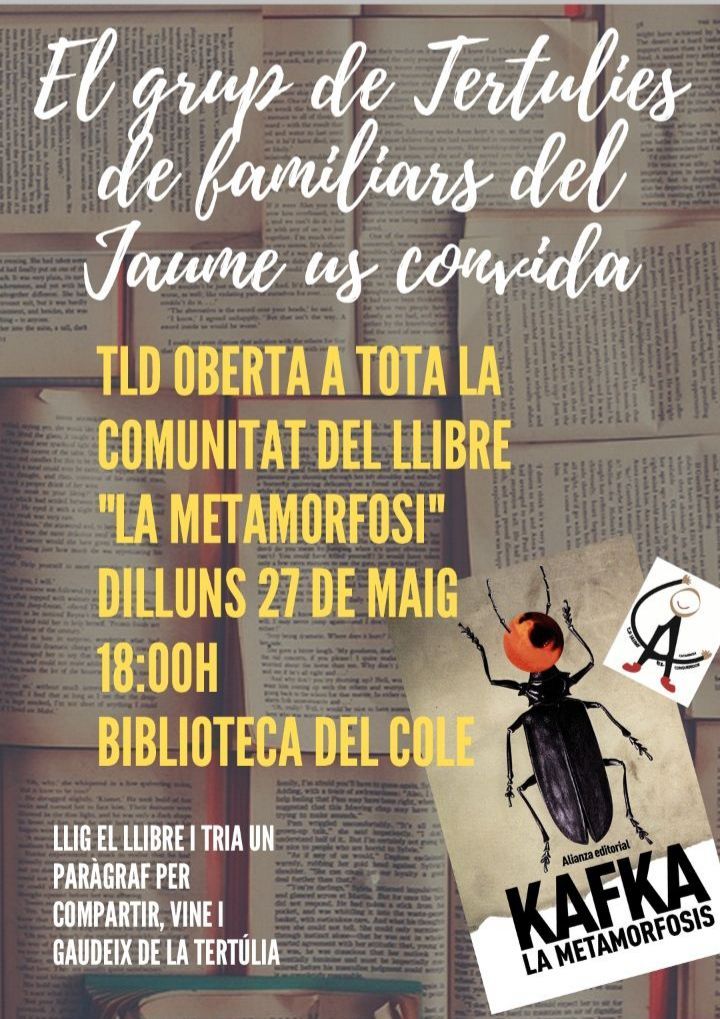El Grupo de Tertulias de familiares del CEIP Jaume I El Conqueridor de Catarroja nos ha invitado a compartir con ellos su próxima tertulia (lunes 27 de mayo a las 18 h) sobre la obra de Franz Kafka «La metamorfosis».