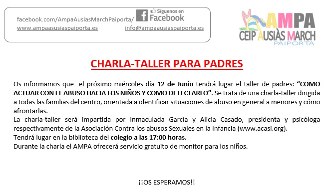 La AMPA del CEIP Ausiàs March organiza, junto a la Asociación Contra los Abusos Sexuales en la Infancia (www.acasi.org), una charla-taller con el título «Cómo actuar con el abuso hacia los niños y cómo detectarlo». Con este taller se pretende identificar las situaciones de abuso en general a menores y cómo afrontarlas. El taller será en la biblioteca del Ausiàs March el miércoles 12 de junio a las 17 h.