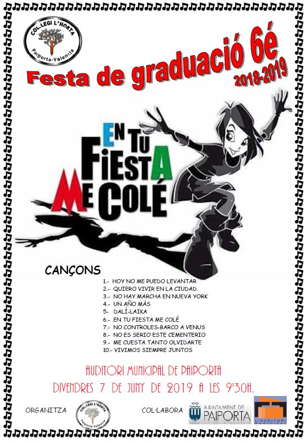 El viernes 7 de junio, en el Auditori de Paiporta, se ha celebrado la graduación de los alumnos de 6º de primaria de nuestro cole, un acto muy emotivo en el cual se ha visto reflejado el grandísimo trabajo del alumnado y profesorado en el musical «En tu fiesta me colé«.