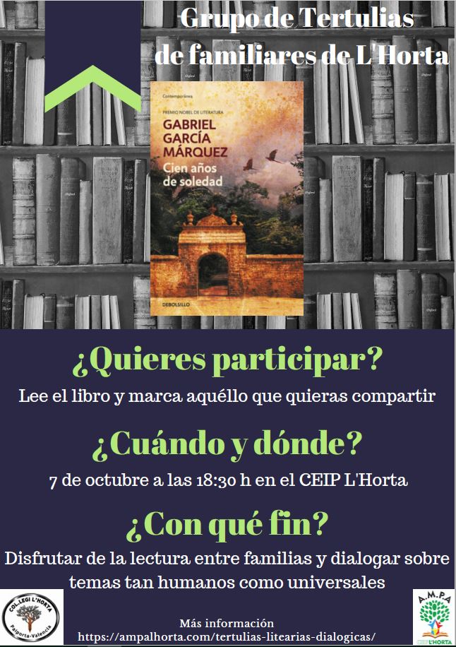 El lunes 7 de octubre, a las 18:30 h, el Grupo de Tertulias de familias de L’Horta se va a reunir en el cole para disfrutar de la tertulia literaria dialógica (TLD) sobre la obra de Gabriel García Márquez «100 años de soledad».