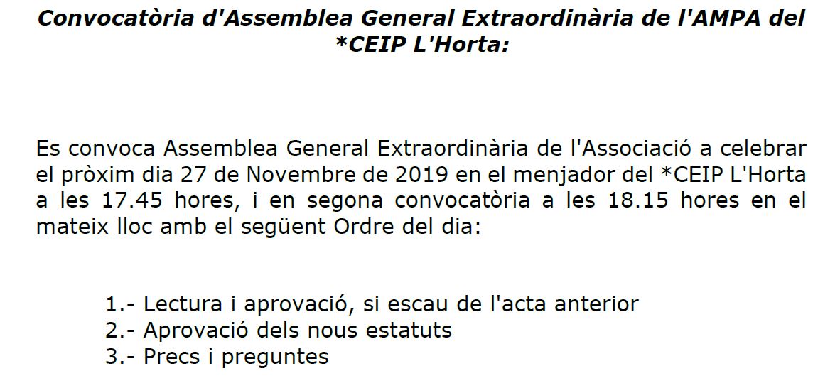 Convocatoria Asamblea General Extraordinaria 27/11/2019