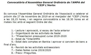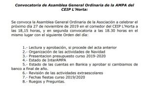 Se convoca la Asamblea General Ordinaria de la Asociación a celebrar el próximo día 27 de noviembre en el comedor del CEIP L’Horta a las 18:15 h, y en segunda convocatoria a las 18:30 h en el mismo lugar, con el siguiente orden del día: