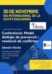 Este sábado 30 de noviembre a las 10 h, dentro de los actos del Día Internacional de la Ciudad Educadora que organiza el Ayuntamiento de Catarroja, han organizado una conferencia del Catedrático Ramón Flecha con el título «Model dialògic de prevenció i resolució de conflictes» (nota en prensa).