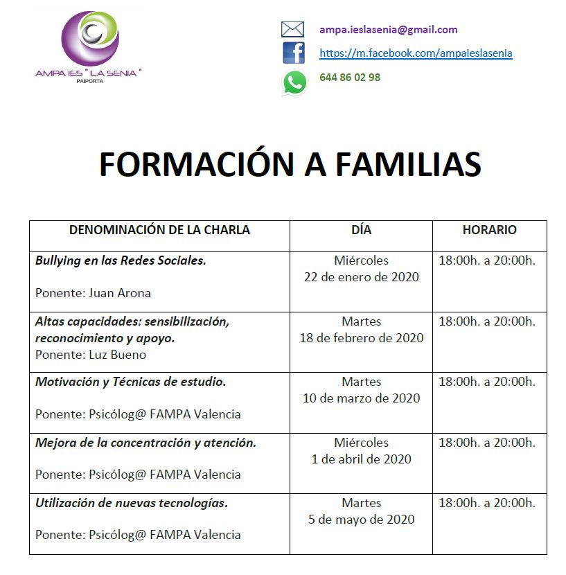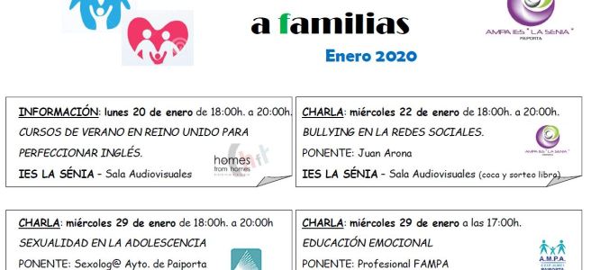 Las AMPAs del IES La Sènia, IES Andreu Alfaro y CEIP Jaume I han organizado formaciones para las familias y han invitado a las familias de nuestro cole a participar. Esta invitación es fruto de la colaboración de las distintas AMPAs de Paiporta a través de la formación de InterAMPA Paiporta.