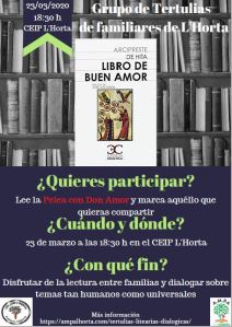 El próximo lunes 23 de marzo a las 18:30 h, el Grupo de Tertulias de familiares de L’Horta continúa con la 2ª sesión de la obra de Juan Ruiz, el Arcipreste de Hita, «Libro de buen amor». La tertulia estará enfocada en comentar el capítulo 2, Pelea con Don Amor. Si estás interesadx, puedes acudir de oyente y ver cómo se desarrolla una Tertulia Literaria Dialógica.