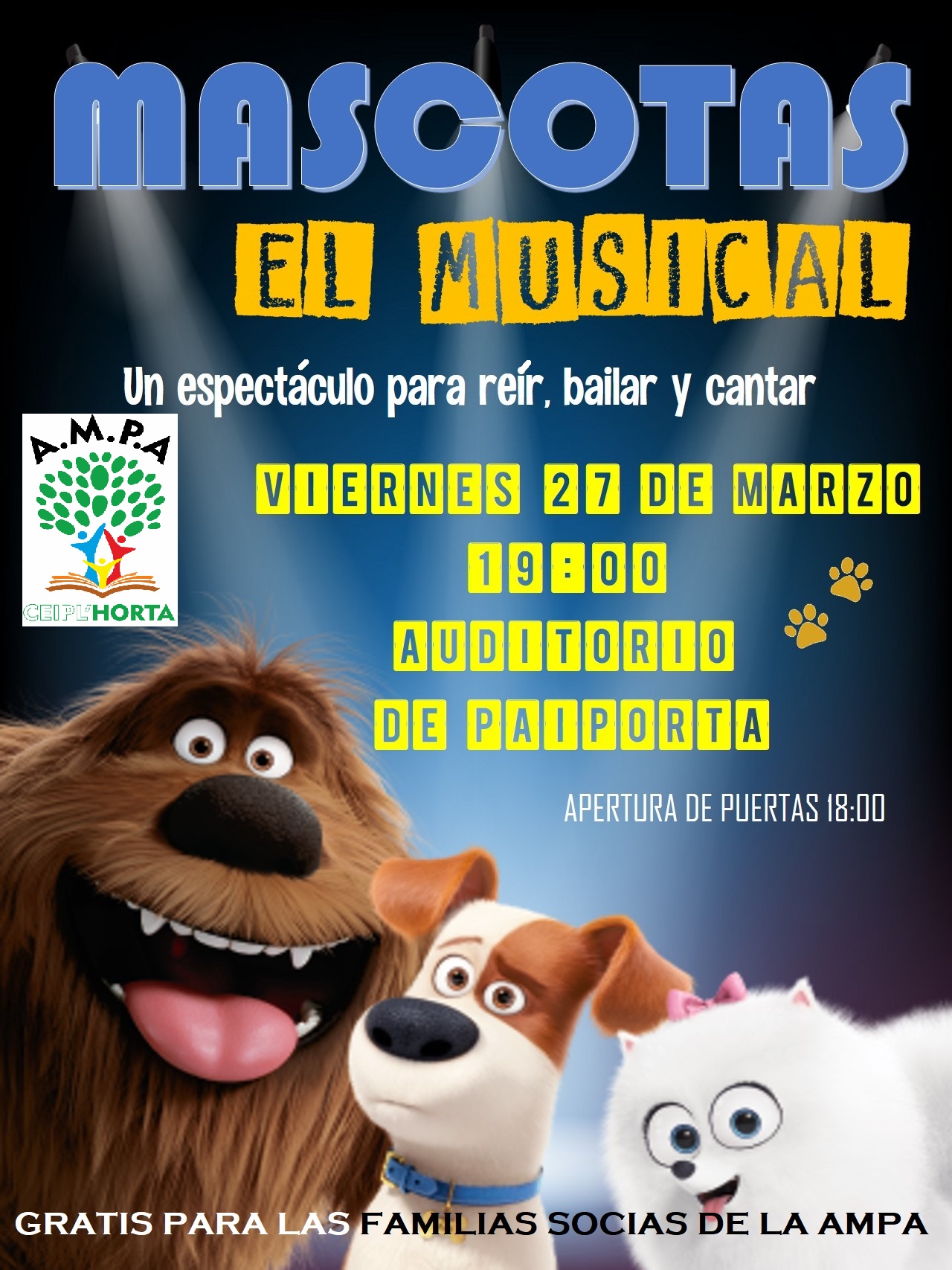 El próximo viernes 27 de marzo, a las 19 h en el Auditori de Paiporta, las comisiones de Fiestas/Eventos y Cultura han organizado para las familias socias el musical Mascotas. Con la colaboración de Blanc i Negre Animació y la Infinity Symphony Band, seguro que las familias disfrutaremos de una tarde entretenida.