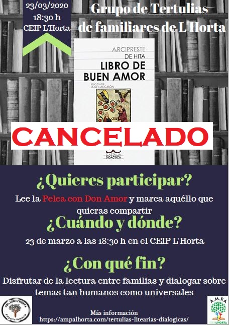 Debido a las medidas adoptadas por el Gobierno, debemos cancelar todas las actividades que teníamos programadas para las familias durante el mes de marzo. Cuando volvamos a la actividad normal, intentaremos volverlas a programar y os avisaremos con tiempo.