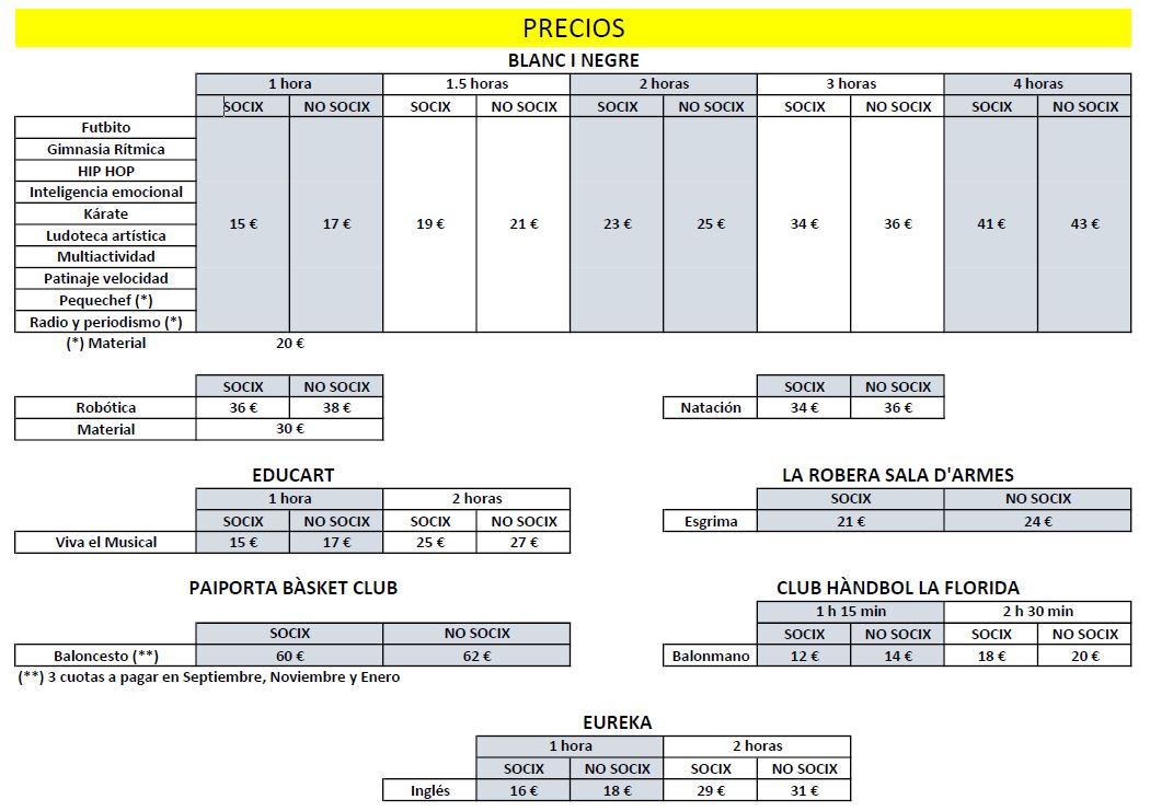 Los datos recabados por este formulario se cederán a Blanc i Negre Animació SL, Educart Valencia, Grupo Eureka, La Robera Sala d’Armes, CH La Florida y Paiporta Bàsquet Club para la gestión de las actividades.