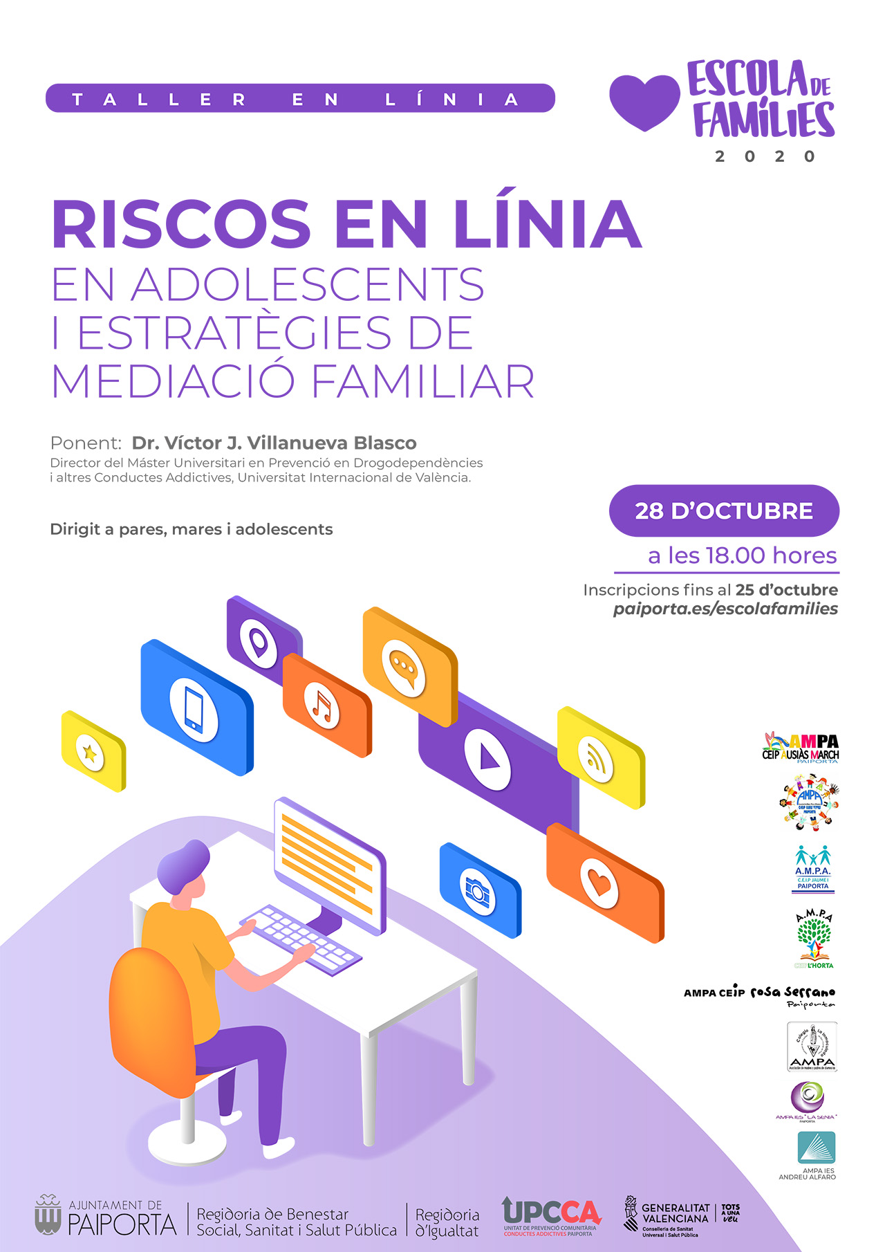 El Ajuntament de Paiporta, junto a las AMPAs que formamos InterAMPA, hemos organizado una formación online con el título «Riscos en línia en adolescents i estratègies de mediació familiar», orientado a madres, padres y adolescentes. La formación será el miércoles 28 de octubre a las 18 h y hay que apuntarse en el enlace https://www.paiporta.es/escolafamilies antes del 25 de octubre que finaliza el plazo.