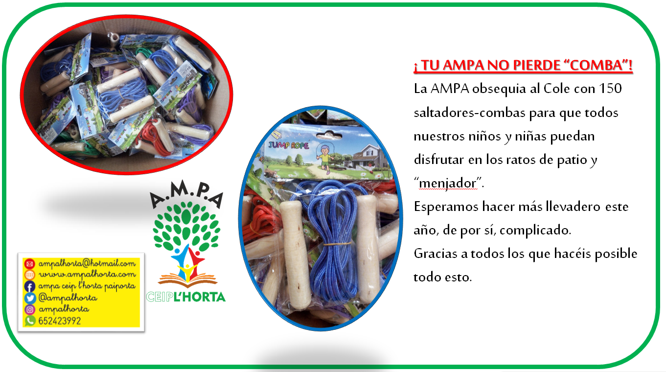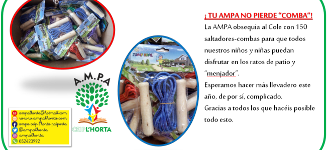 Desde AMPA hemos querido colaborar con el cole en los kits deportivos que ha confeccionado por clase para que nuestras niñas y niños puedan jugar sin peligro en las horas de descanso del patio y del menjador. Hemos aportado nuestro granito de arena con 150 combas que han sido repartidas por las distintas clases.