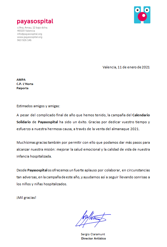 Un año más, la ONG PayaSOSpital nos da las gracias por nuestra colaboración en este difícil año. Dadas las circunstancias la participación por parte de otros colegios ha disminuido y nos están muy agradecidas por haber seguido con nuestra aportación, como el año pasado.