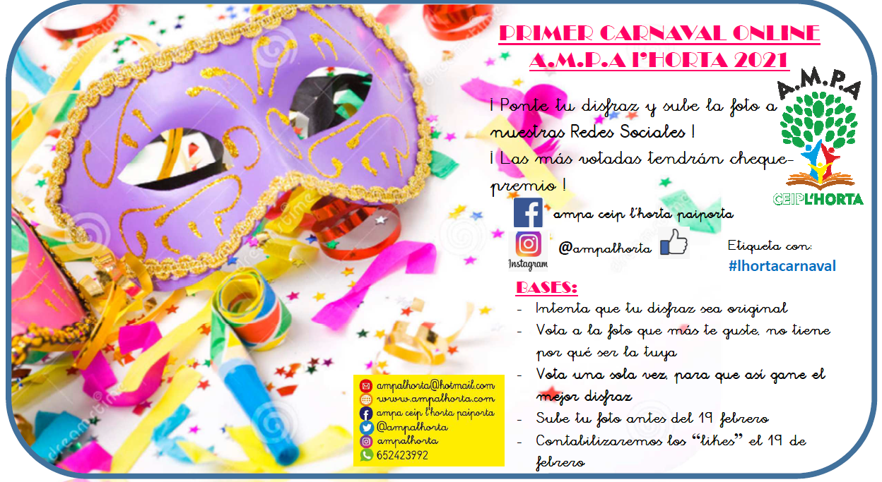 Si quieres participar, disfrázate y sube una foto a las Redes Sociales (Facebook e Instagram) con la etiqueta #lhortacarnaval . Las 3 fotos con más likes en cada red se llevarán un cheque-regalo para canjear en el comercio de Paiporta (la misma foto no puede ser ganadora en ambas redes y la familia debe ser socia de la AMPA en este curso).