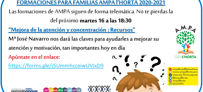 Las formaciones de nuestra AMPA, junto con INTERAMPA y FAMPA-València, siguen de forma telemática. No te pierdas la del próximo martes 16 a las 18:30, con el título “Mejora de la atención y concentración : Recursos”, impartida por Mª José Navarro.