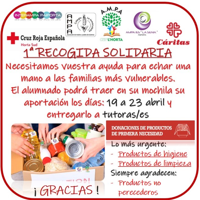 Las AMPAs del IES La Sénia. Colegio La Inmaculada y L’Horta se unen a través de InterAMPA para poner en marcha la 1ª Campaña Recogida Solidaria, que se donarán a Cruz Roja Española de Paiporta y a Cáritas Paiporta.