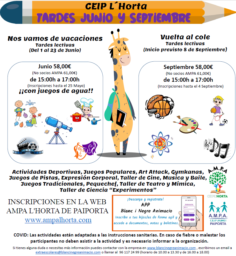Si quieres conocer más datos sobre la actividad, puedes realizarlo a través de tu AMPA o bien poniéndote en contacto con Blanc i Negre (extraescolares@blancinegreanimacio.com o 961172499).