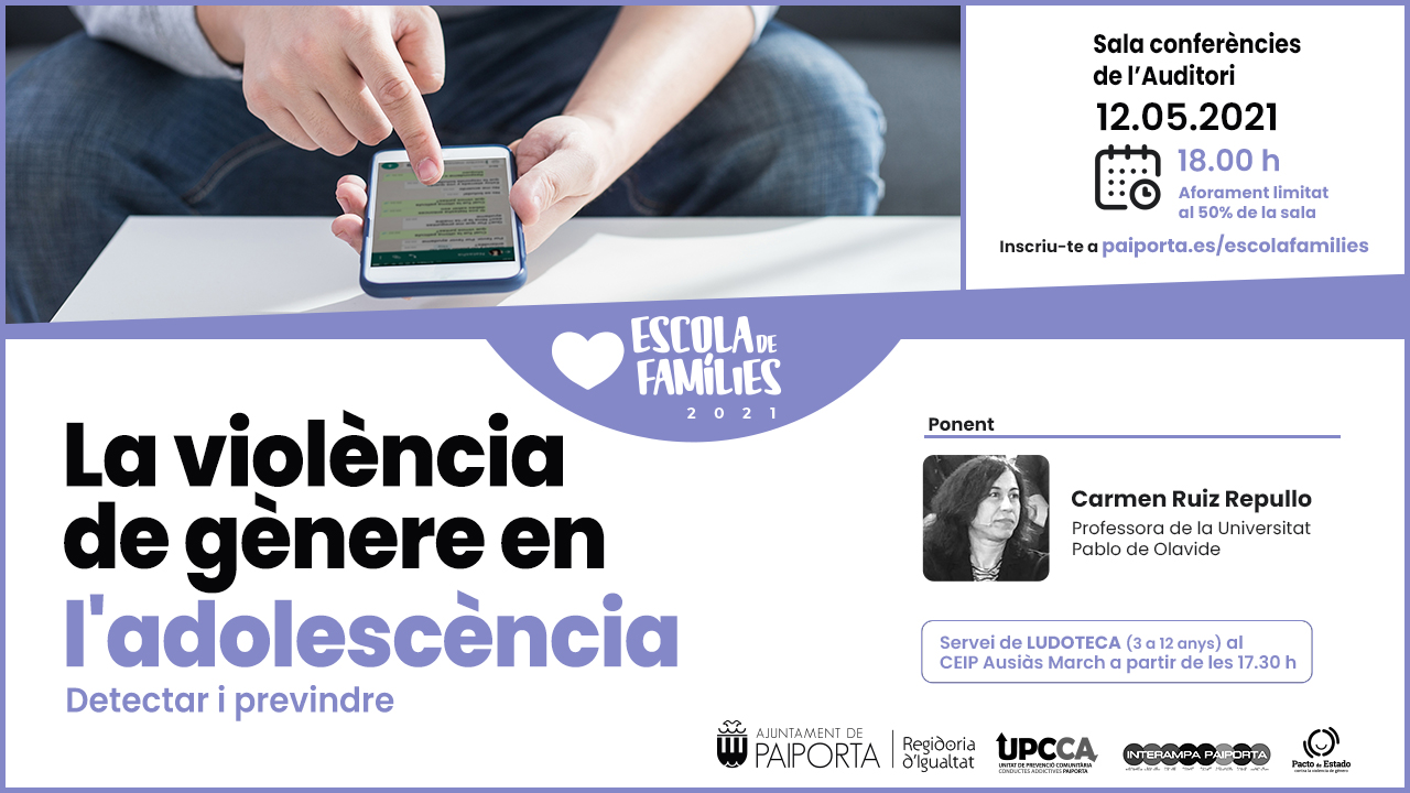 Este próximo miércoles 12 de mayo, a las 18 h, la Regidoria de Igualtat junto a InterAMPA han organizado la charla «La violencia de género en la adolescencia. Detectar y prevenir» de la prestigiosa ponente Carmen Ruiz Repullo (si quieres saber más de Carmen, pincha aquí).