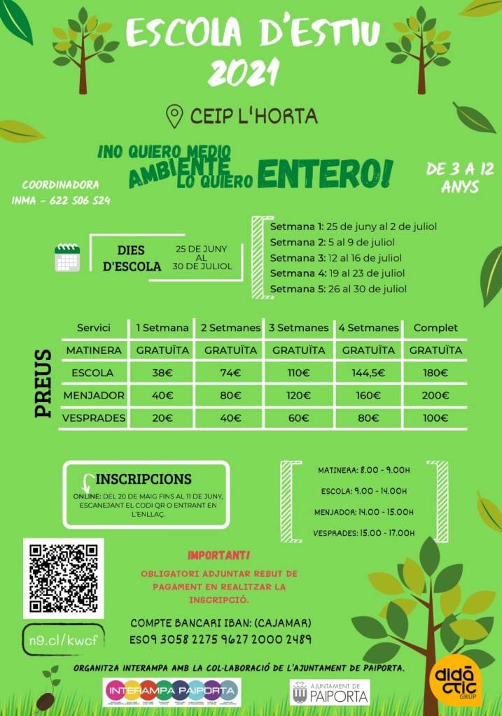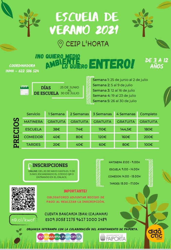 Si están interesada/o en apuntar a tus hijas/os, pincha aquí y te redirigimos a la página de inscripción. Si tienes alguna duda / sugerencia, puedes hacerlo a través de una llamada telefónica a Inma (622506524), que es la coordinadora de esta actividad. El miércoles 16 de junio, a las 18 h, en el patio del CEIP L’Horta, hemos convocado una reunión informativa para las familias que ya hayan apuntado a sus hijas/os o a aquéllas que quieran tener más información.