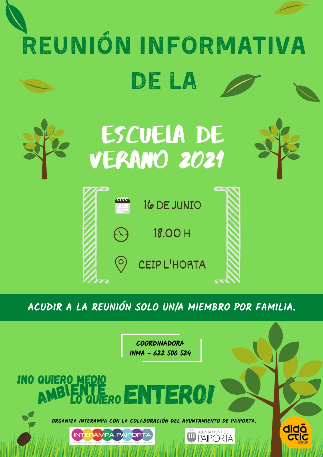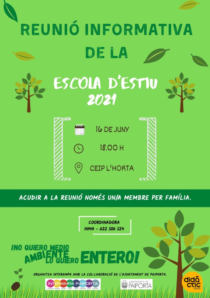 El miércoles 16 de junio, a las 18 h, en el patio del cole, Grup Didàctica e InterAMPA han convocado una reunión informativa para todas las familias que vayan a hacer uso del servicio de la Escoleta este verano o bien las que están dudando y quieren resolver sus dudas.