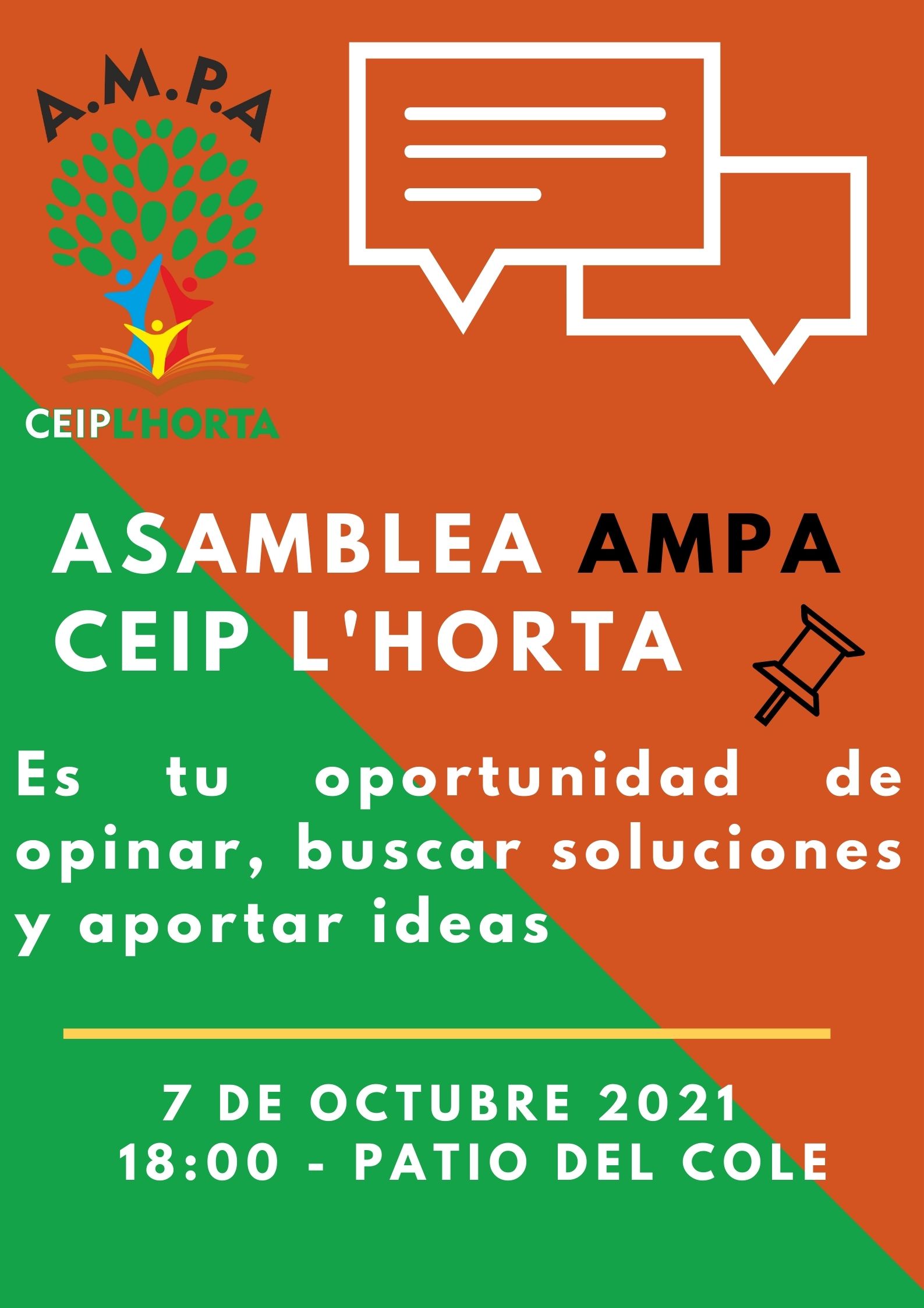 Se convoca a las familias socias a la Asamblea General Ordinaria de inicio de curso, que se celebrará el jueves 7 de octubre, a las 18 h en primera convocatoria, y 18:15 h en segunda, al patio de nuestro cole, con el siguiente orden del día: