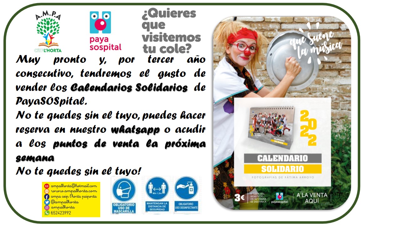 Por tercer año consecutivo, la Comisión AMPA solidaria coordina la venta de calendarios de la ONG PayaSOSpital. Este complicado año, las niñas y niños hospitalizados necesitan más que nunca esa alegría que los payasos y payasas de esta ONG les llevan a sus habitaciones de hospital.