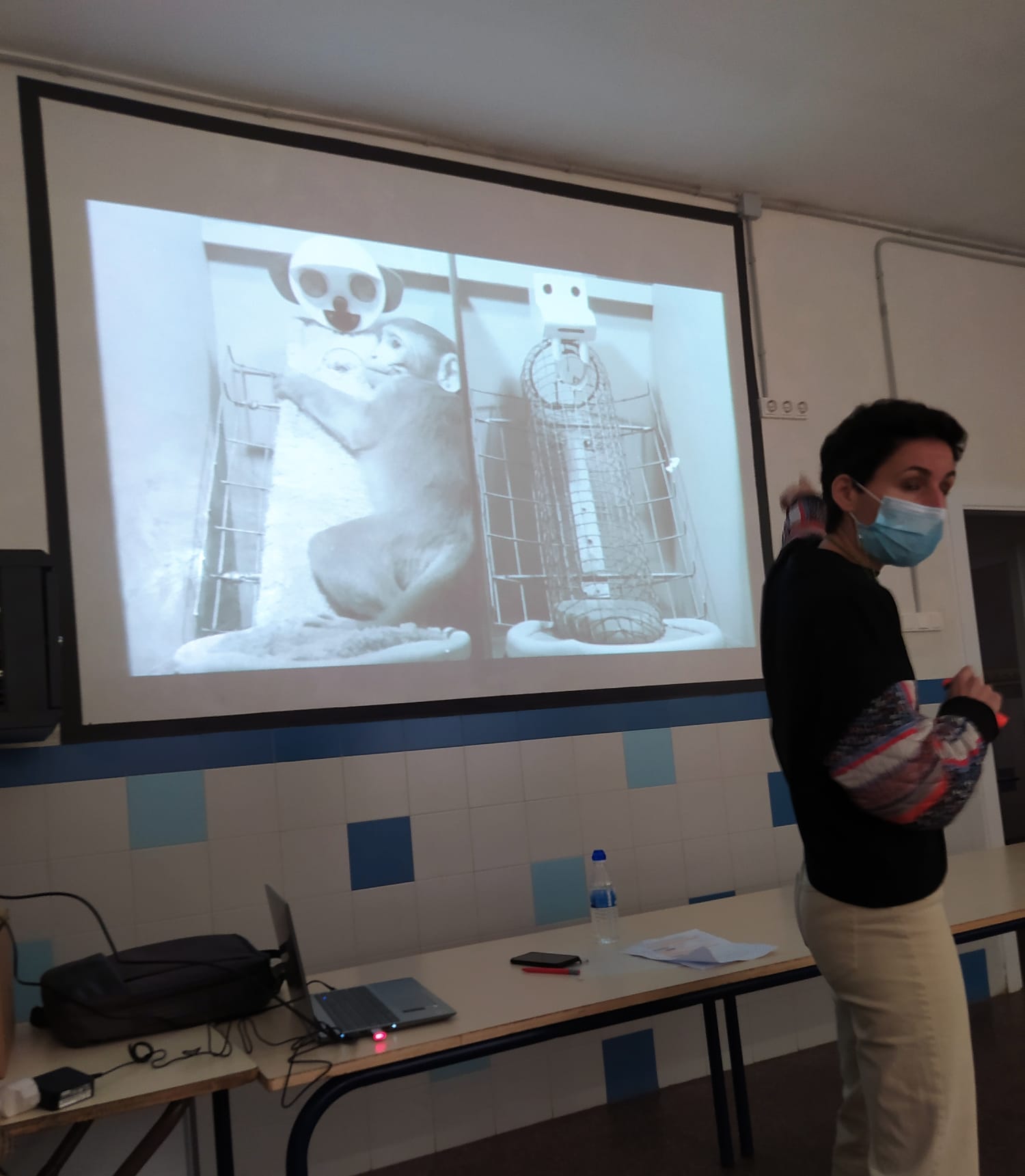 María nos ha mostrado un experimento hecho con monos, en el que ponían a los monos con una madre de metal que les alimentaba, y con otra con un traoio de felpa, de manera que se pasaban gran parte del día con la del trapo de felpa, e iban sólo a la madre de hierro cuando tenían hambre, motivo que justifica que nuestras/os pequeñas/os necesitan por encima de todo cariño y afecto de manera incondicional.