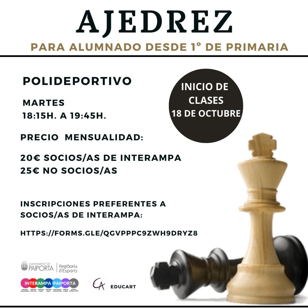 InterAMPA organiza una actividad extraescolar de Ajedrez semanal, los martes de 18:15 a 19:45h, en el Polideportivo Municipal. Las familias que sois socias de nuestra AMPA tenéis un descuento de 5€ porque pertenecemos a InterAMPA. Se acepta alumnado a partir de primaria y las plazas son limitadas. La primera clase será el 18 de octubre.