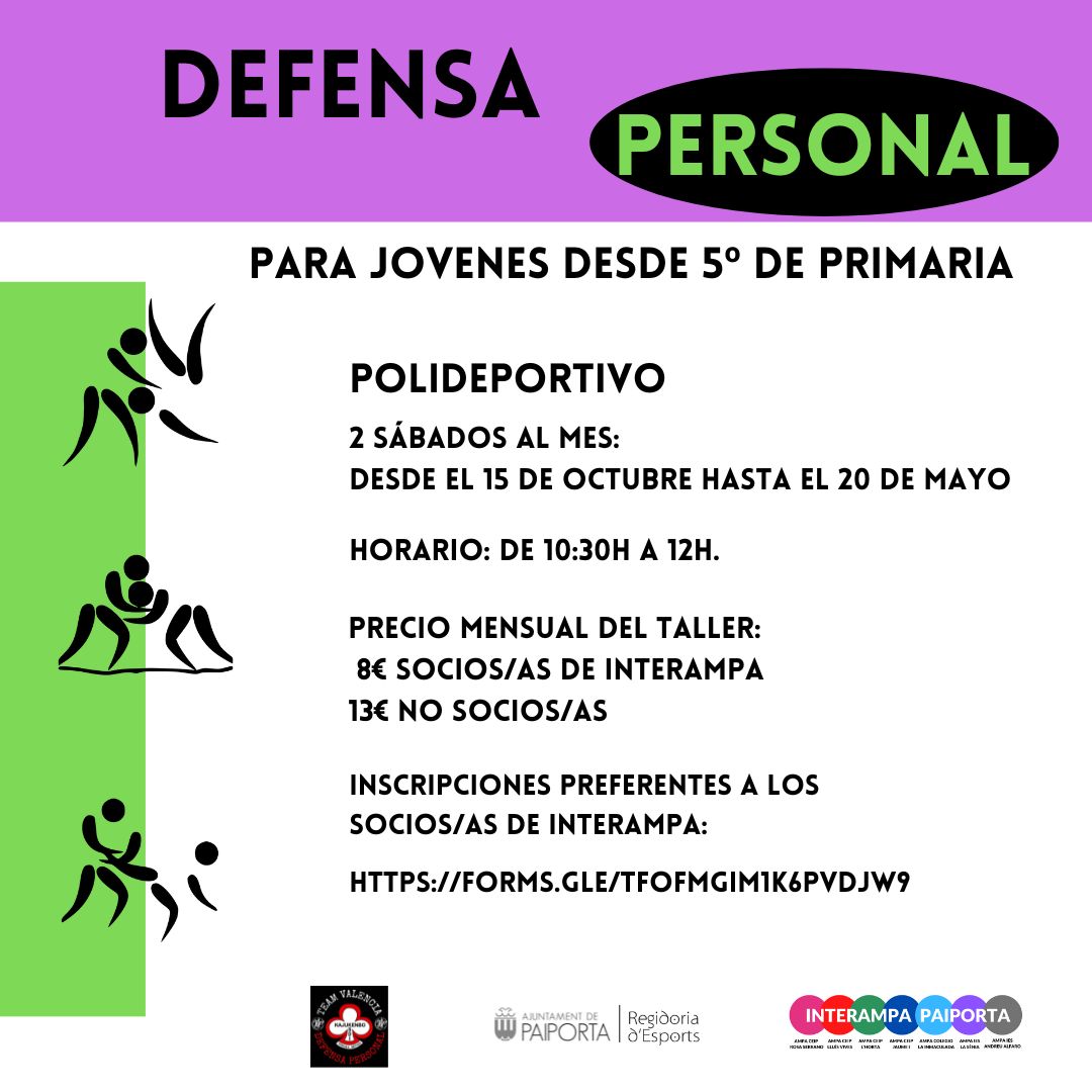 InterAMPA organiza un taller anual de Defensa Personal 2 veces por mes, los sábados de 10:30 a 12 h, en el Polideportivo Municipal. Las familias que sois socias de nuestra AMPA tenéis un descuento de 5€ porque pertenecemos a InterAMPA. Se acepta alumnado a partir de 5º de primaria y las plazas son limitadas. La primera clase será el 15 de octubre.