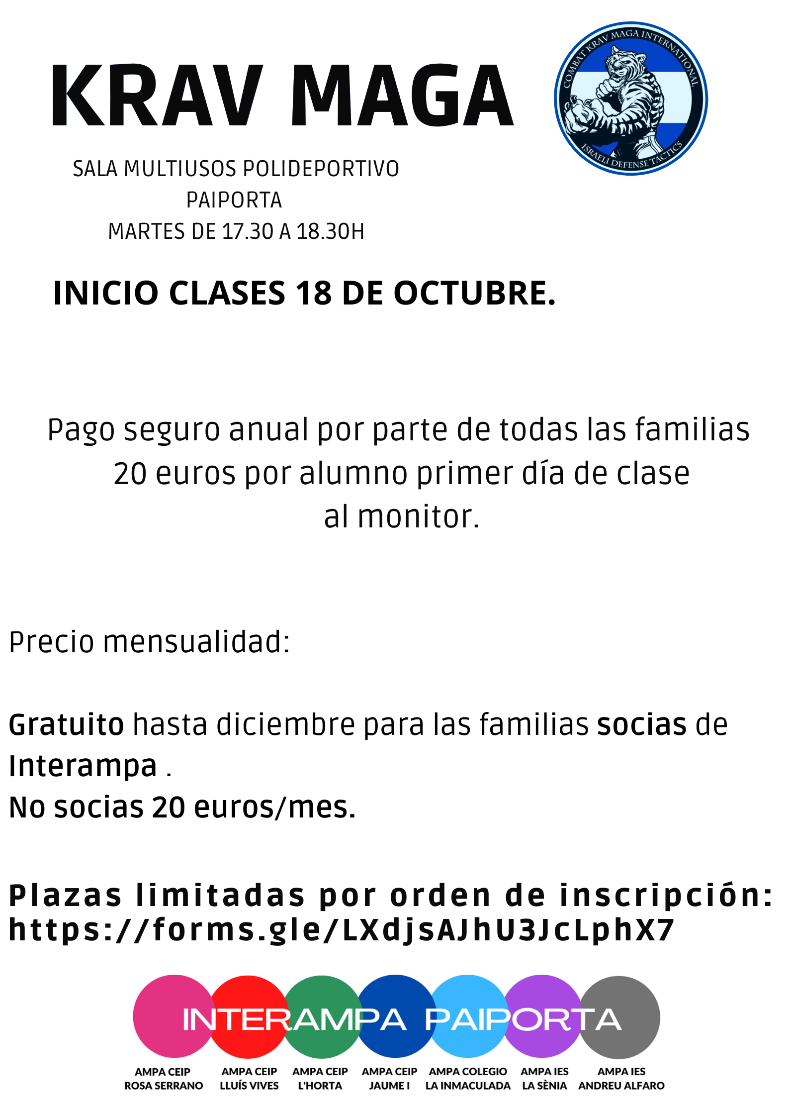 Ya puedes hacer la inscripción al taller gratuito de Krav Maga que organiza InterAMPA para sus familias socias (para niñas y niños de 9 a 15 años). Será gratuito hasta diciembre y tendrá continuidad en enero con un pago que será reducido para las familias socias de InterAMPA. Las clases serán los martes de 17:30 a 18:30 h en el Polideportivo Municipal, y comienzan este martes 18 de octubre. Hace falta la contratación de un seguro de accidentes que tiene un coste anual de 20 €. ¡No tardes y realiza la inscripción! Más abajo tienes el formulario para realizar la inscripción.
