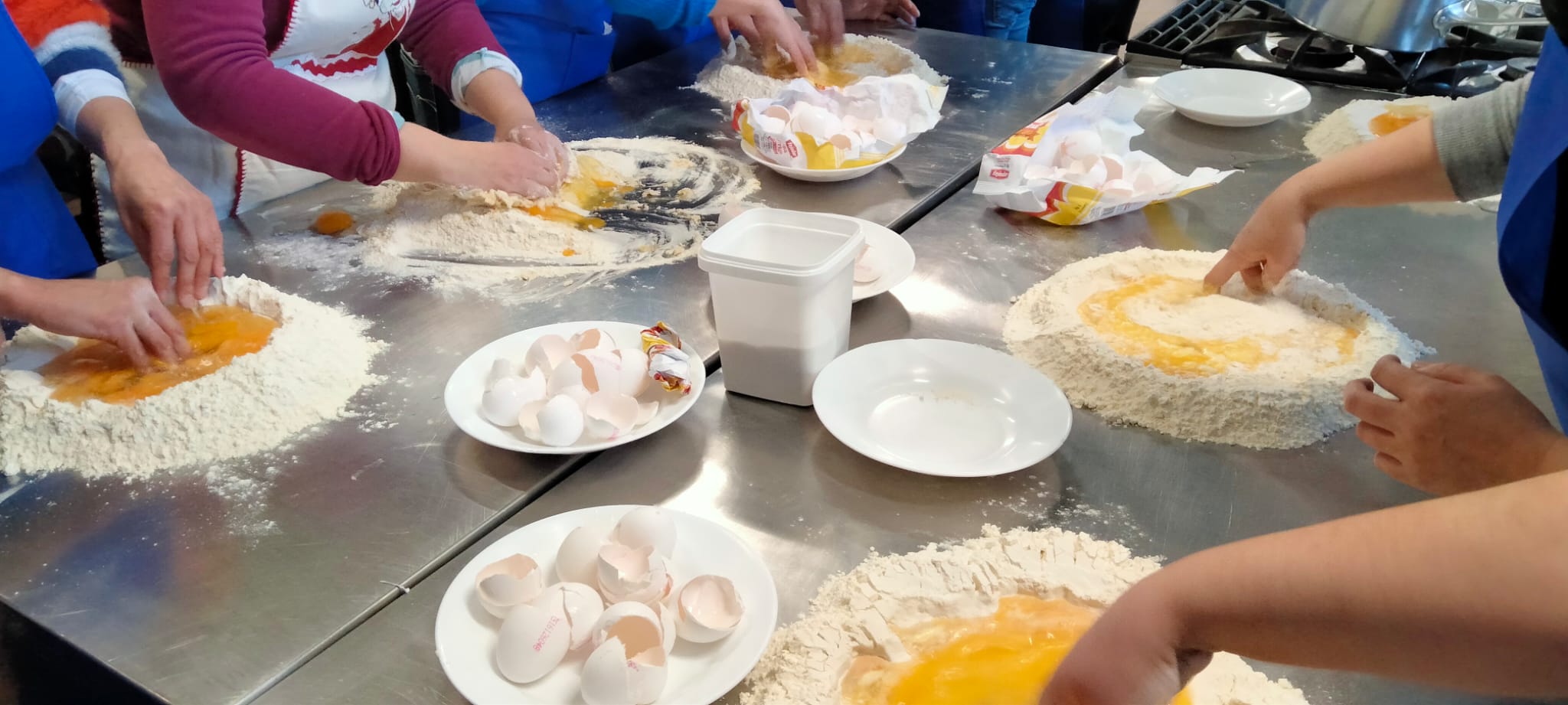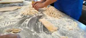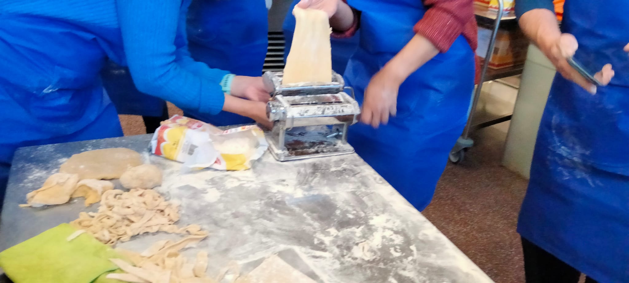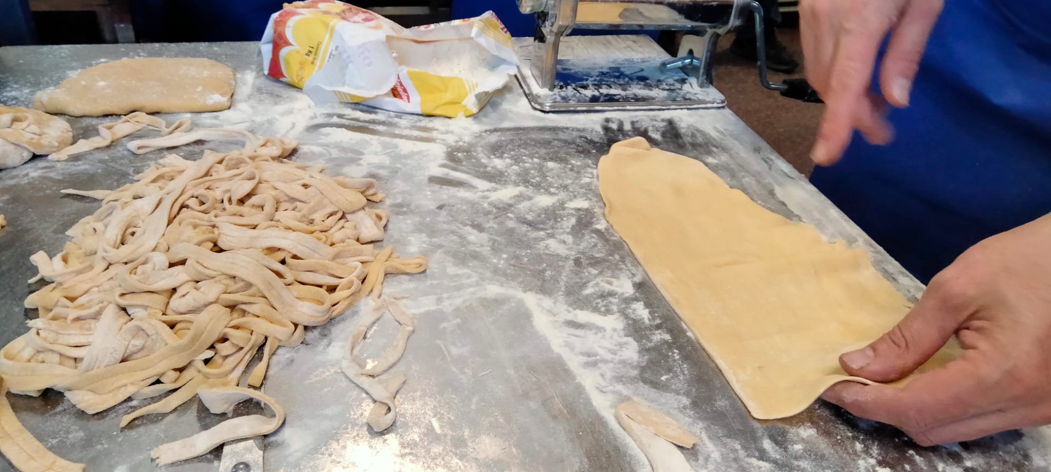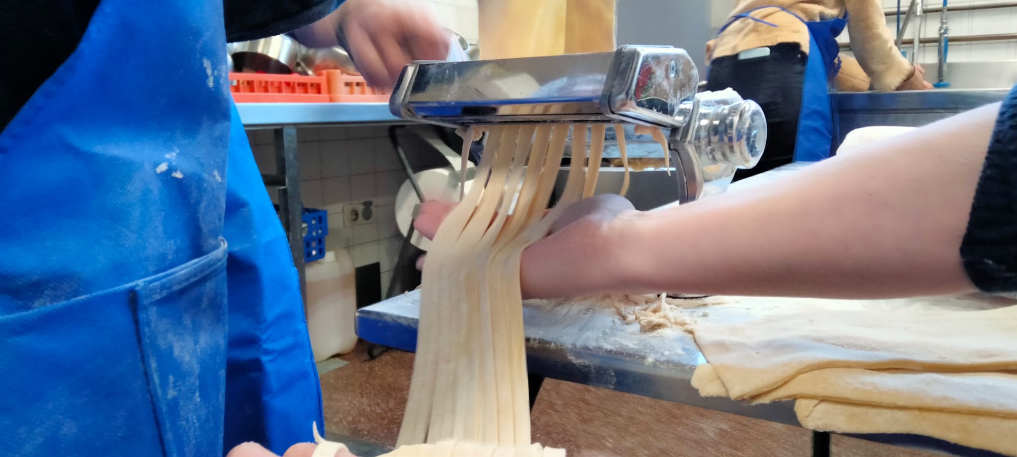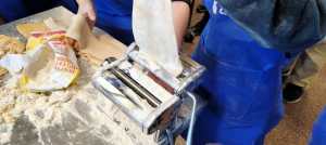 A las mamás y papás nos esperaba un kilo de harina y una docena de huevos en el brillante banco de trabajo de Juani y Luisa. Poco a poco le fuimos dando forma a la masa hasta formar una bola y, después, con ayuda de una máquina para hacer pasta fresca, teníamos un montón de fetuccini esperando su baño de agua caliente.