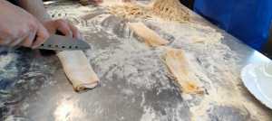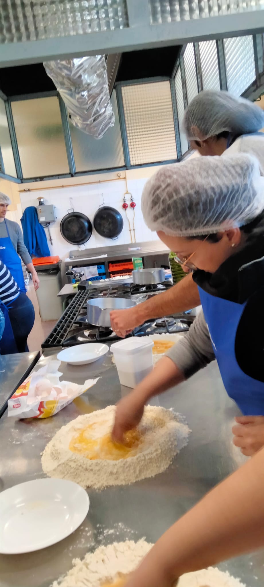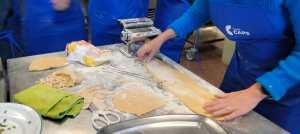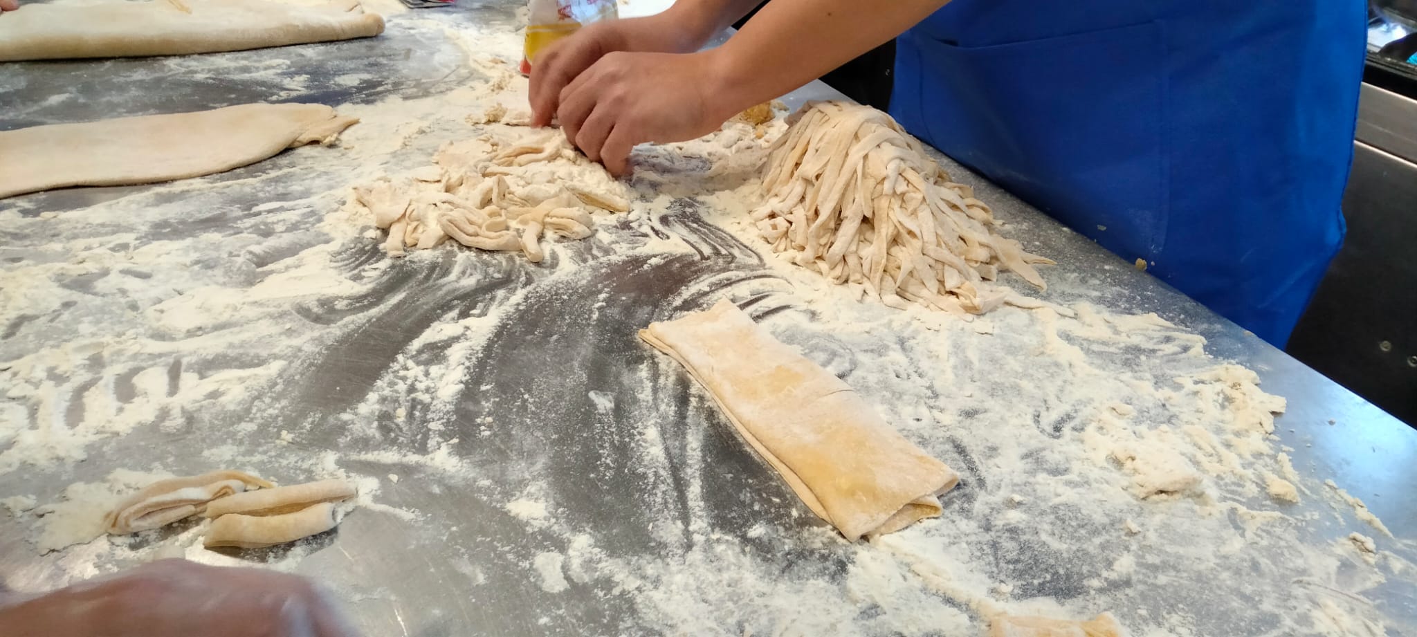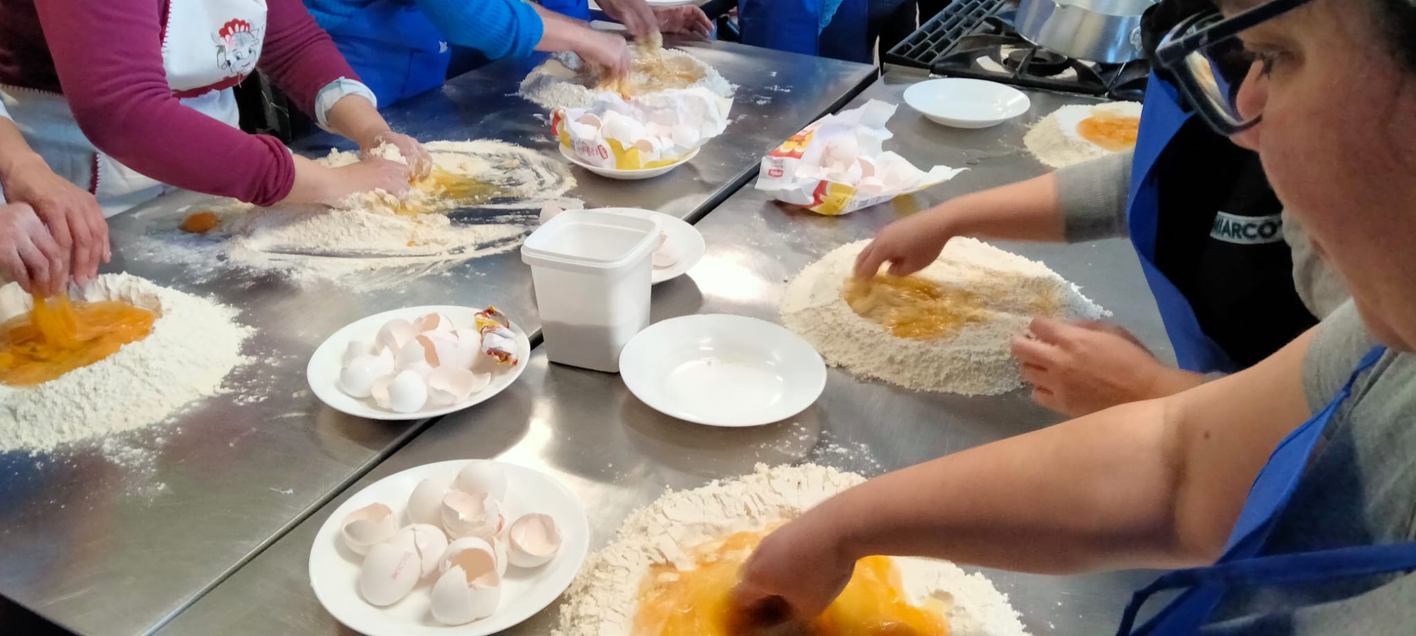 A las mamás y papás nos esperaba un kilo de harina y una docena de huevos en el brillante banco de trabajo de Juani y Luisa. Poco a poco le fuimos dando forma a la masa hasta formar una bola y, después, con ayuda de una máquina para hacer pasta fresca, teníamos un montón de fetuccini esperando su baño de agua caliente.