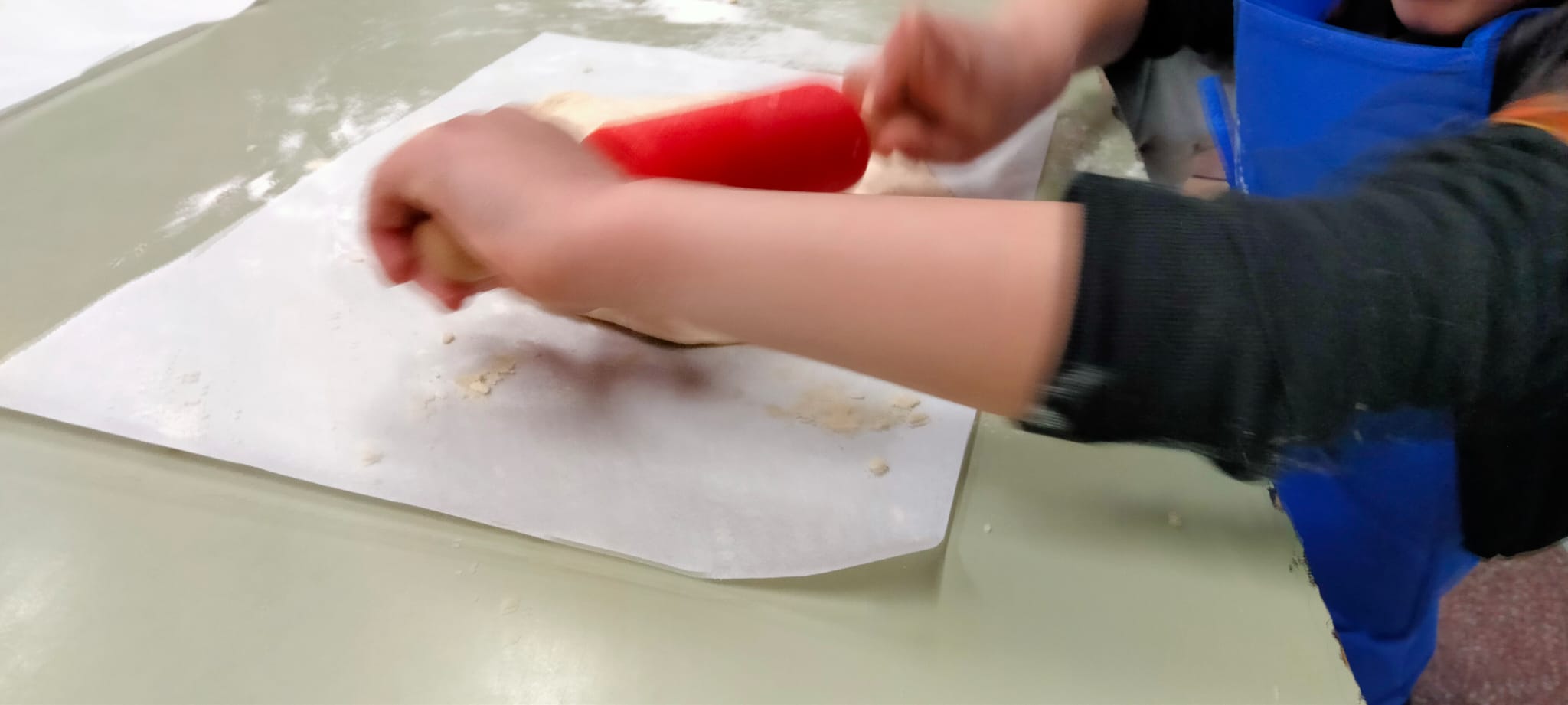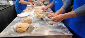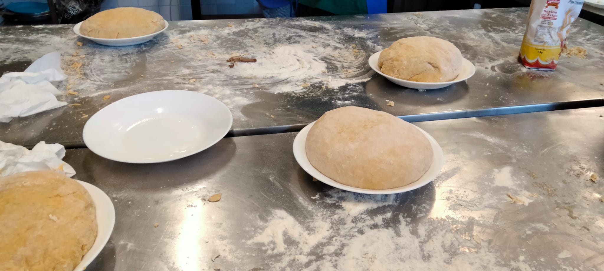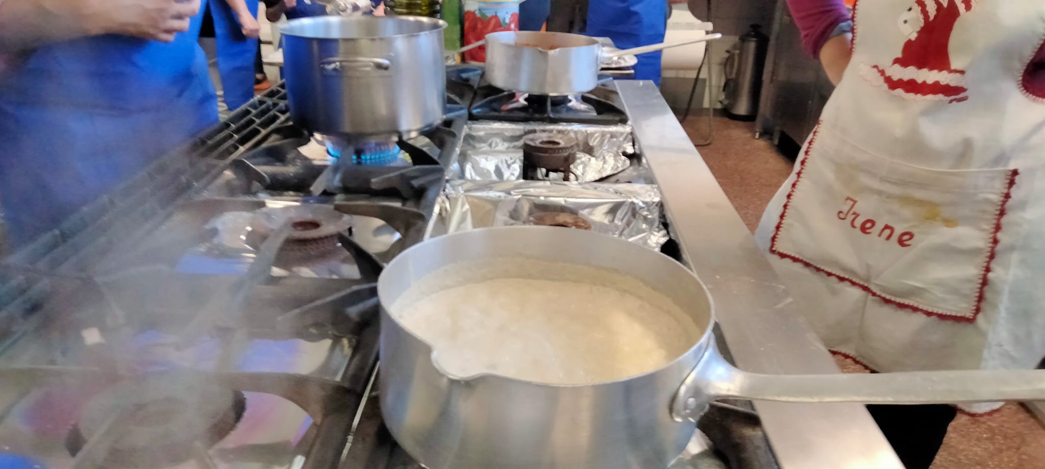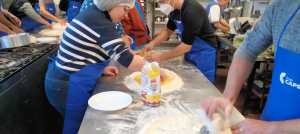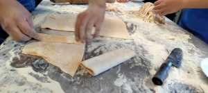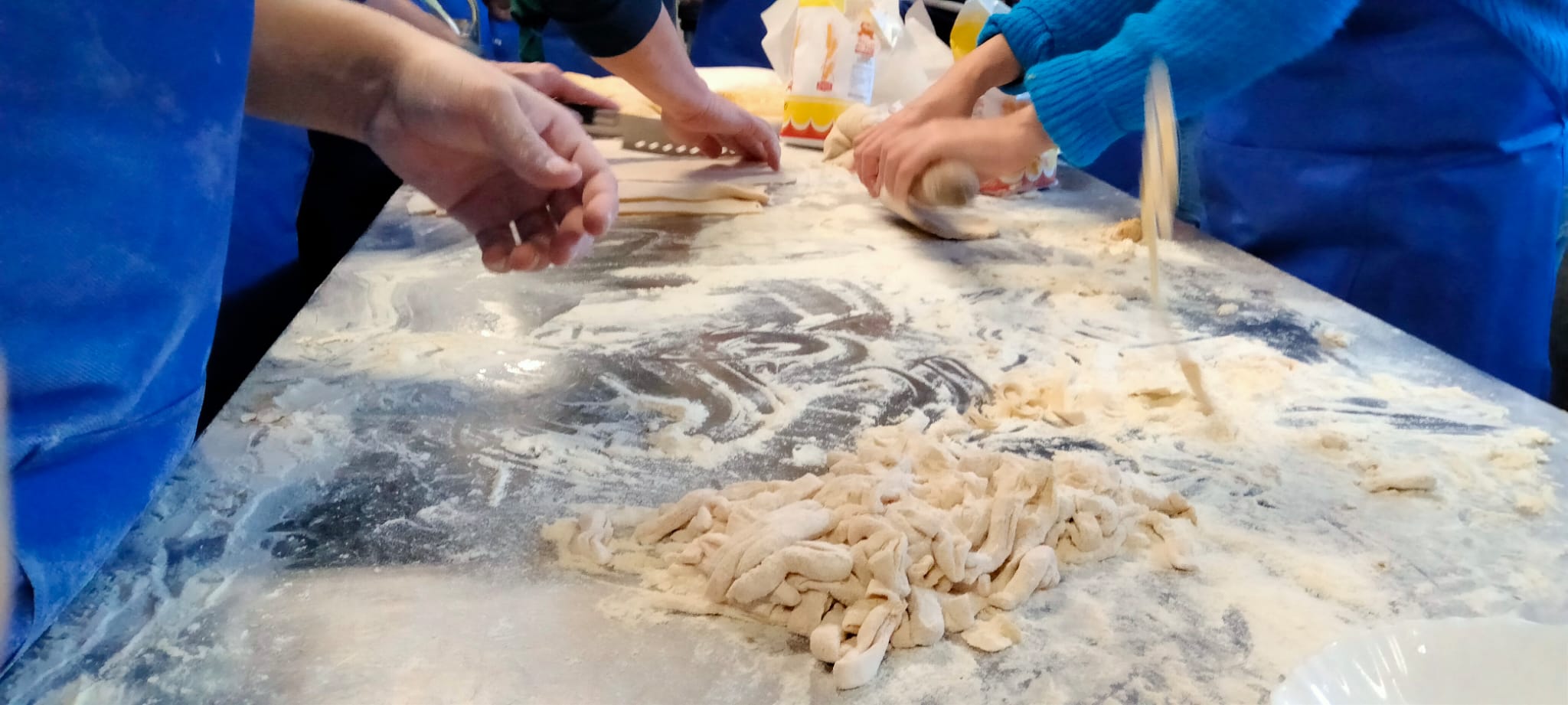 A las mamás y papás nos esperaba un kilo de harina y una docena de huevos en el brillante banco de trabajo de Juani y Luisa. Poco a poco le fuimos dando forma a la masa hasta formar una bola y, después, con ayuda de una máquina para hacer pasta fresca, teníamos un montón de fetuccini esperando su baño de agua caliente.