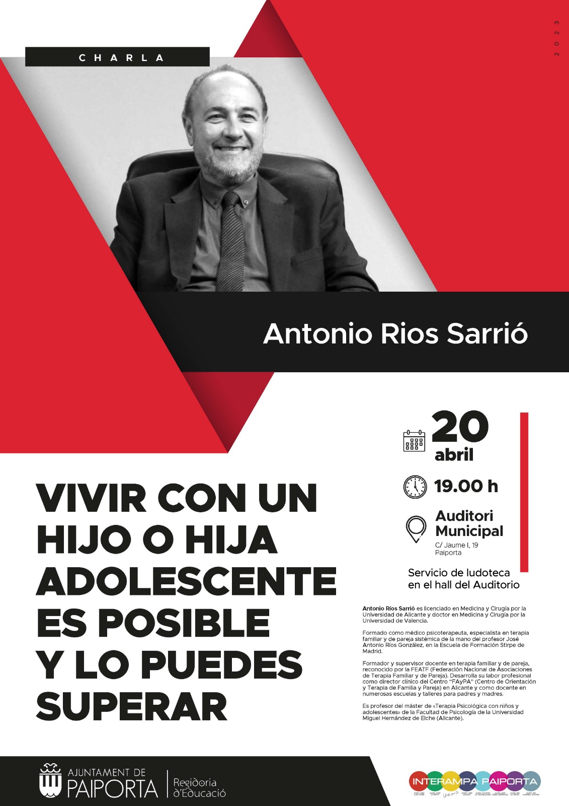 El próximo jueves 20 de abril, a partir de las 19 h, en el Auditori Municipal, os invitamos a la charla del prestigioso doctor Antonio Ríos organizada por el departamento de Educación del Ayuntamiento e InterAMPA.
