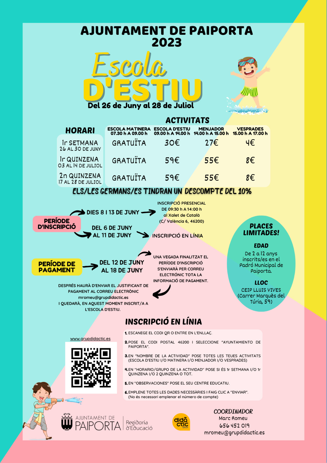 Ya se ha abierto el periodo de inscripción para la Escoleta d’Estiu que organiza el Ayuntamiento. Este año se celebrará en el CEIP Lluís Vives.