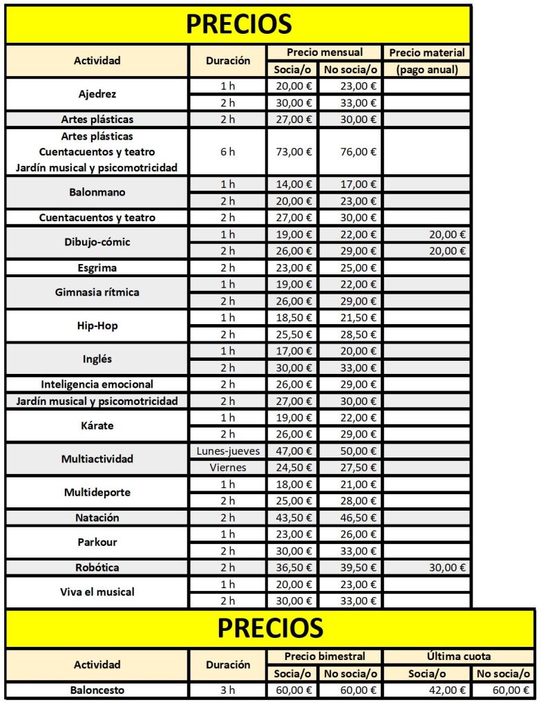 - Baile moderno, Kárate, Gimnasia rítmica, Inteligencia emocional, Parkour, Natación, Robótica, Dibujo-cómic, Multideporte y Multiactividad