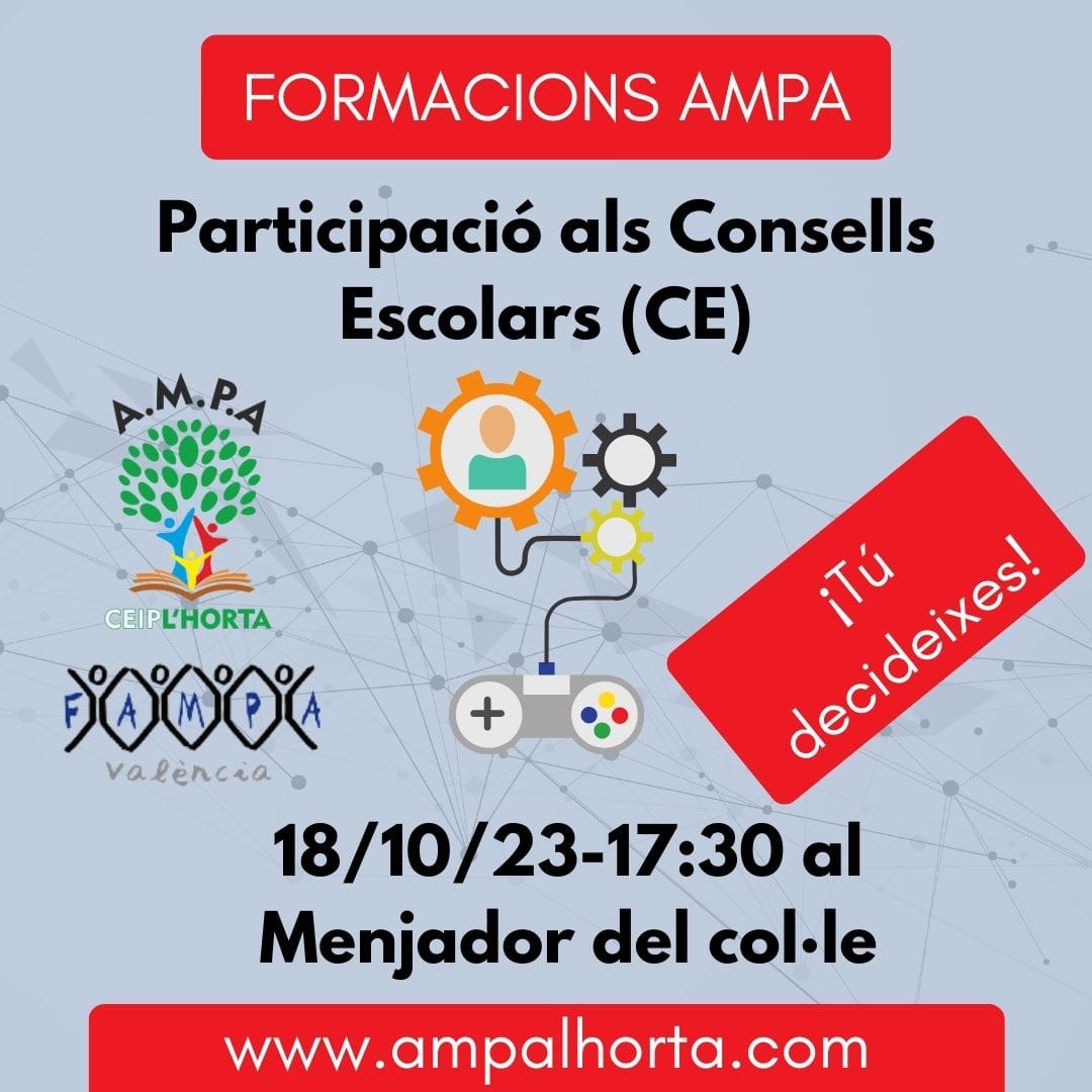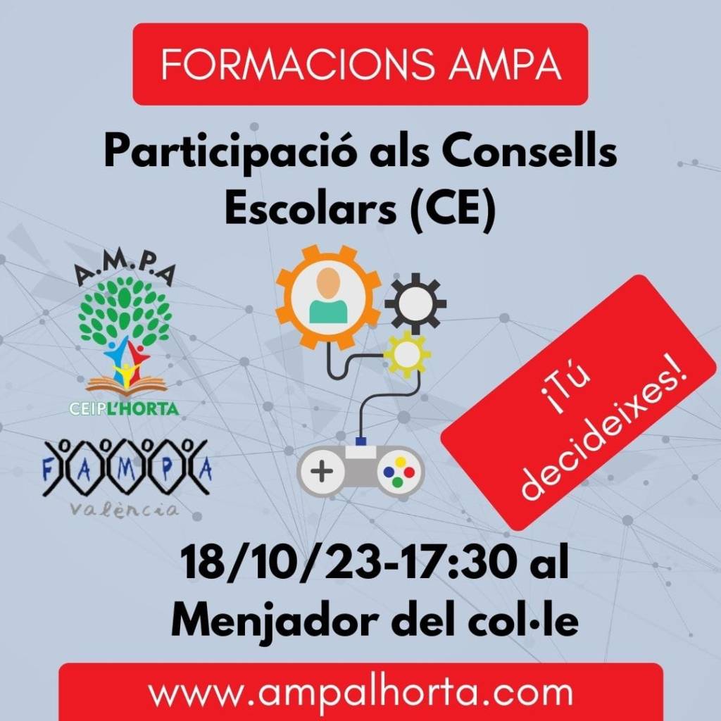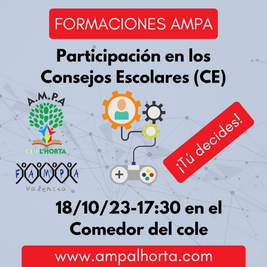 Desde la AMPA, junto a FAMPA-València, os proponemos una formación el próximo miércoles 18 de octubre a las 17:30 h para que conozcáis las competencias del CE y plazos para presentar la candidatura. La formación será en el comedor del cole y tendremos servicio de ludoteca por si vienes con tu hija/o.