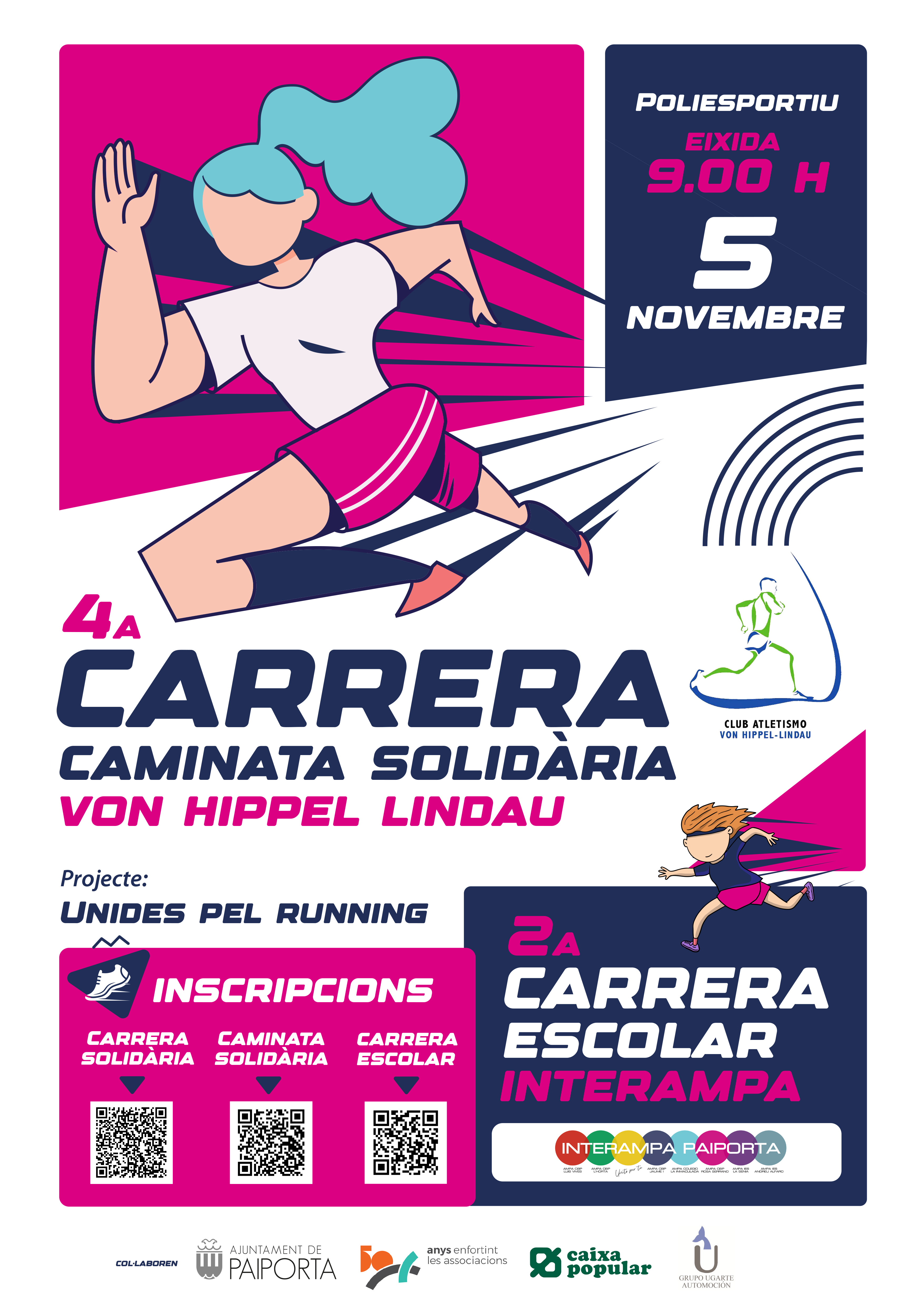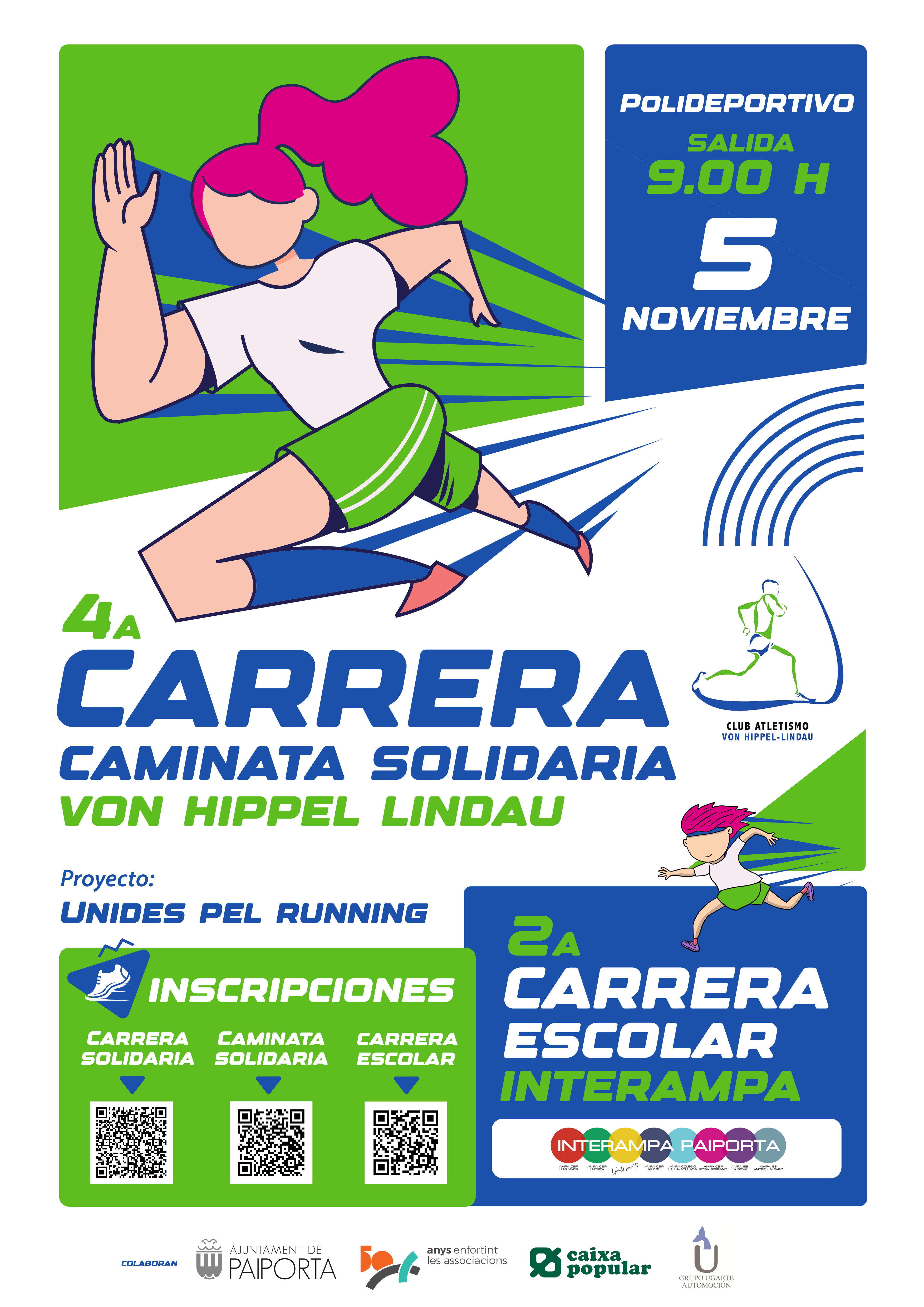 Por segundo año, InterAMPA Paiporta y el Club de Atletismo Von Hippel Lindau organizan la 4ª Carrera-Caminata Solidaria VHL y la 2ª Carrera Escolar InterAMPA. Este año, las carreras serán el domingo 5 de noviembre a partir de las 9 h, comenzando con las carreras de adultas/os.