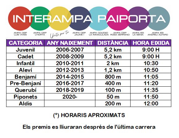 El centro que más participantes presente, obtendrá un premio de InterAMPA para material deportivo, por lo que es importante vuestra participación para poder conseguirlo. El año pasado fuimos, junto al IES Andreu Alfaro, el centro con más participantes (160), por lo que este año debemos superarnos. Además, habrá camiseta para todas/os las/os participantes, copas para las/os 3 primeras/os en cada categoría y sorteo de varios obsequios donados por las Regidoria d’Educació i Esport y la Regidoria de Joventut del Ajuntament de Paiporta.