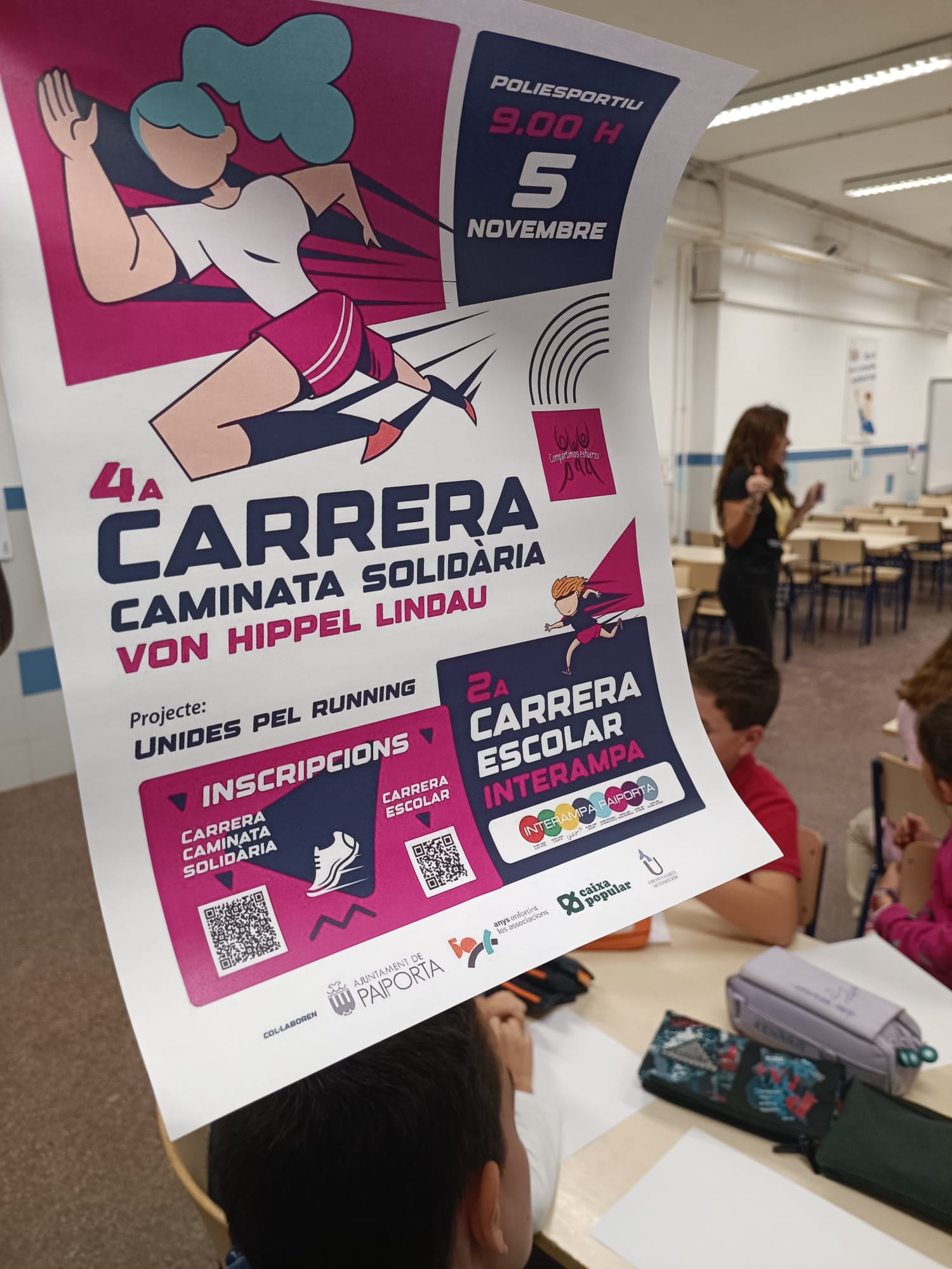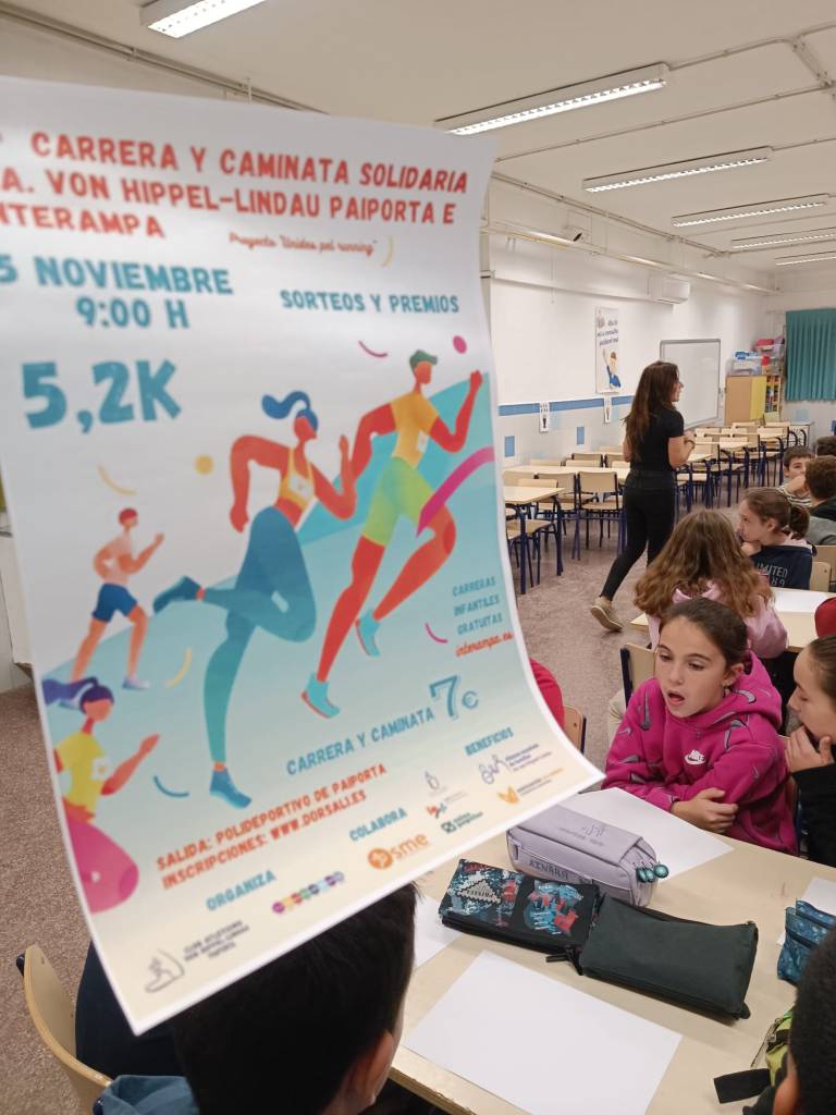 También se ha hecho hincapié en la carrera escolar que se hacía el fin de semana para recaudar fondos para la Asociación de familias afectadas. Cada una de nuestras niñas y niños han hecho un dibujo de ánimo a las familias y se han expuesto el día de la carrera, en las paredes del poli donde se ubicó la salida. La carrera está dentro del proyecto interasociativo «Unides pel running», organizado por InterAMPA y C.A. Von Hippel-Lindau, con la colaboración de Fundació Horta Sud, Caixa Popular y Grupo Ugarte Automoción.