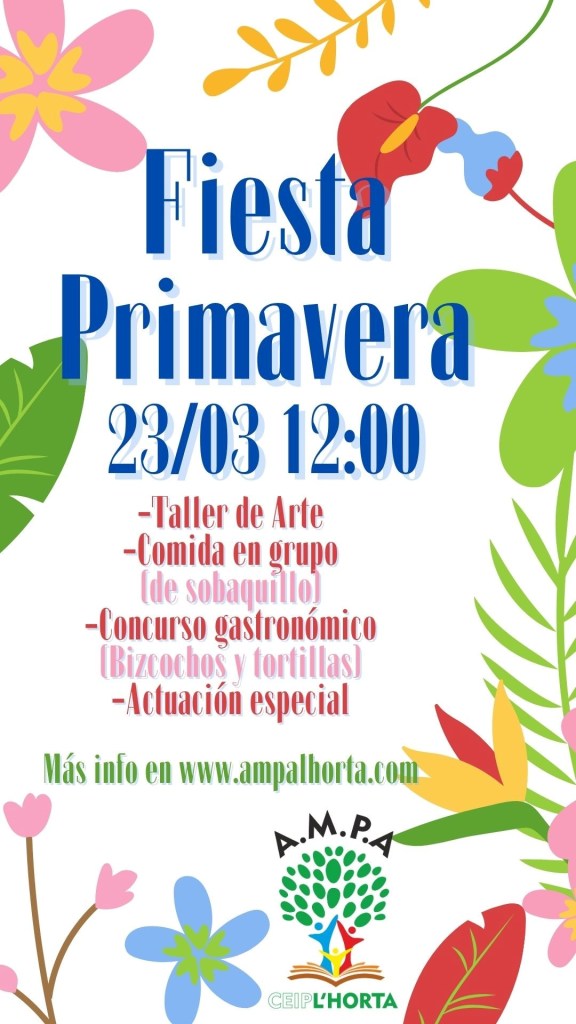 os comunicamos que el próximo sábado 23 de marzo de 2024, se realizará la Fiesta de la Primavera en el Cole, en horario de 12 a 19 horas.