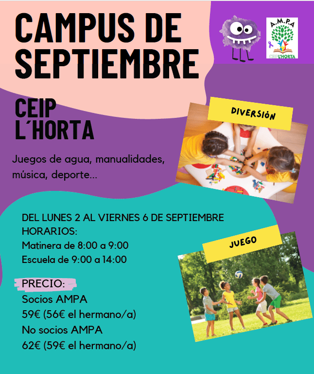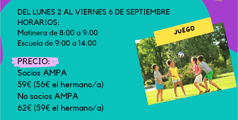 La actividad la organizaremos conjuntamente con GRUPO EUREKA SL en nuestro cole. Las actividades propuestas os las haremos llegar a lo largo de este mes, donde no faltará deporte, talleres artísticos y, sobre todo, ¡agua!.