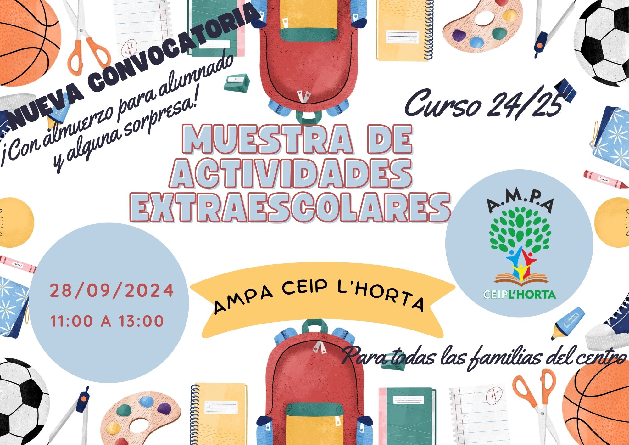 Os esperamos este sábado a partir de las 11 h. Podrás preguntar por las actividades extraescolares programadas este curso. Además, hay merienda para niñas y niños, y alguna sorpresa más. ¡Os esperamos!