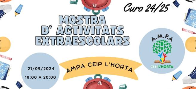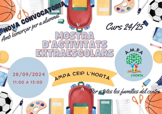 Us esperem aquest dissabte a partir de les 11 h. Podràs preguntar per les activitats extraescolars programades per aquest curs. A més, hi ha berenar per les xiquetes i xiquets, amb alguna sorpresa més. Us esperem!