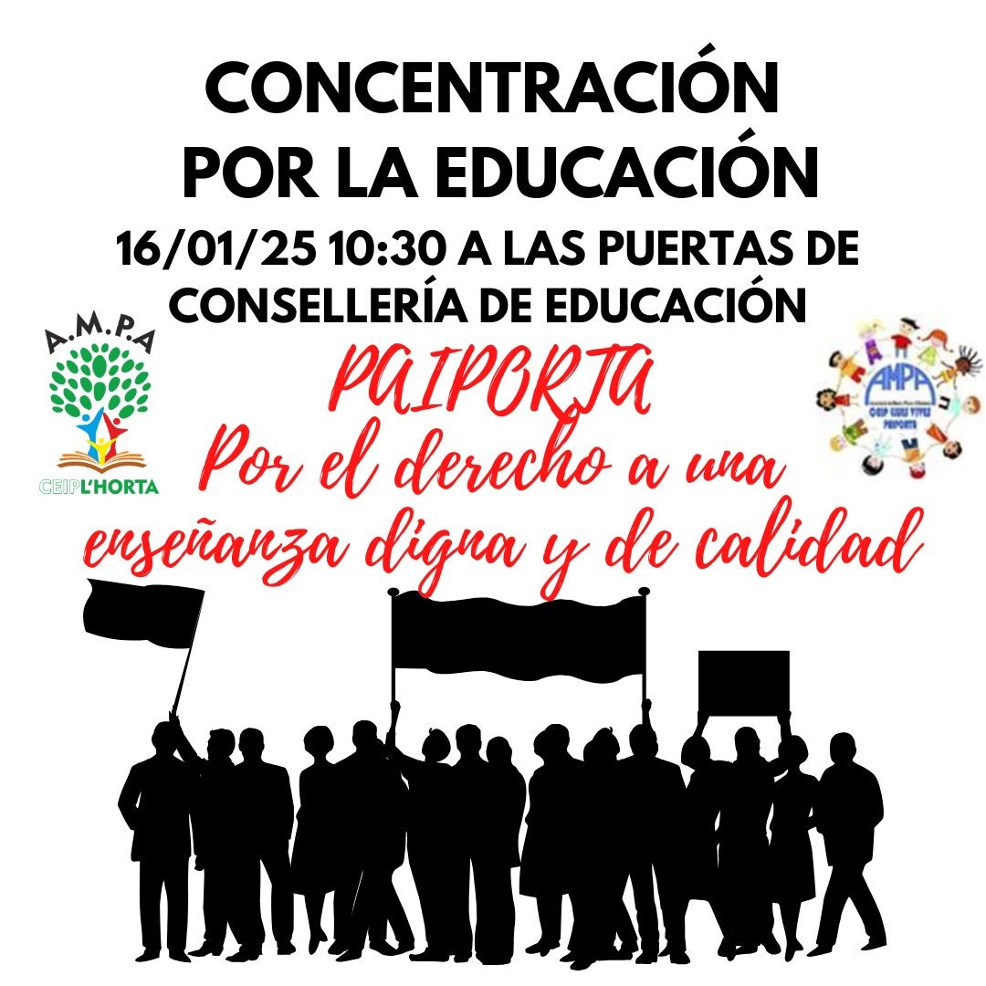 Este jueves 16 de enero os emplazamos en la puerta de la Conselleria de Educación para reclamar los derechos de nuestras niñas y niños que están siendo vulnerados desde el 29 de octubre. Necesitamos contar con vuestra presencia para que lleguen nuestras reivindicaciones y poder obtener respuestas.