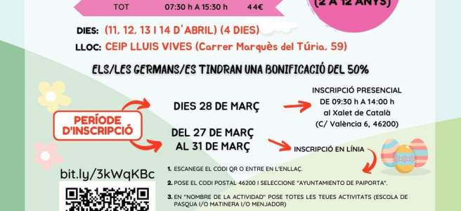 Ya tenemos los datos para la inscripción a la Escoleta de Pascua que organiza el departamento de Educación del Ayuntamiento de Paiporta entre el 11 y el 14 de abril. Puedes realizar la inscripción online entre el 27 y 31 de marzo (pincha aquí y te llevamos a la web para realizar la inscripción) o … Sigue leyendo Inscripciones a la Escoleta de Pascua